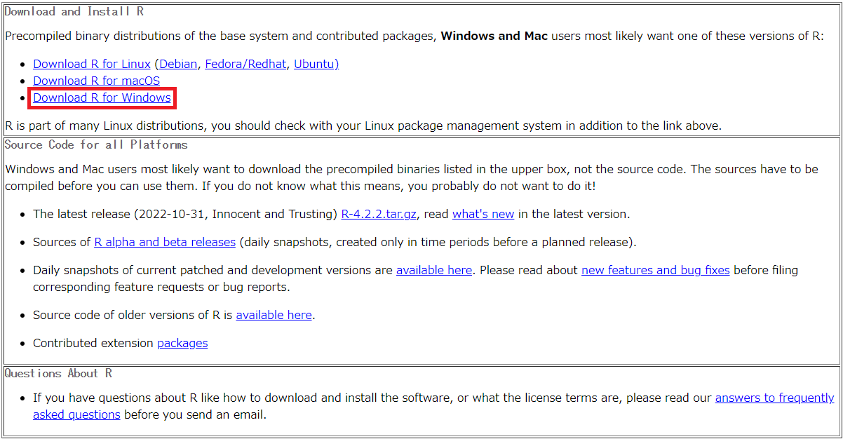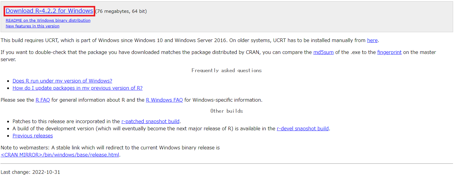 次の画面に遷移する.Download R-4.2.2 for Windowsをクリックすると最新版のダウンロードが始まる(2023年1月16日現在).