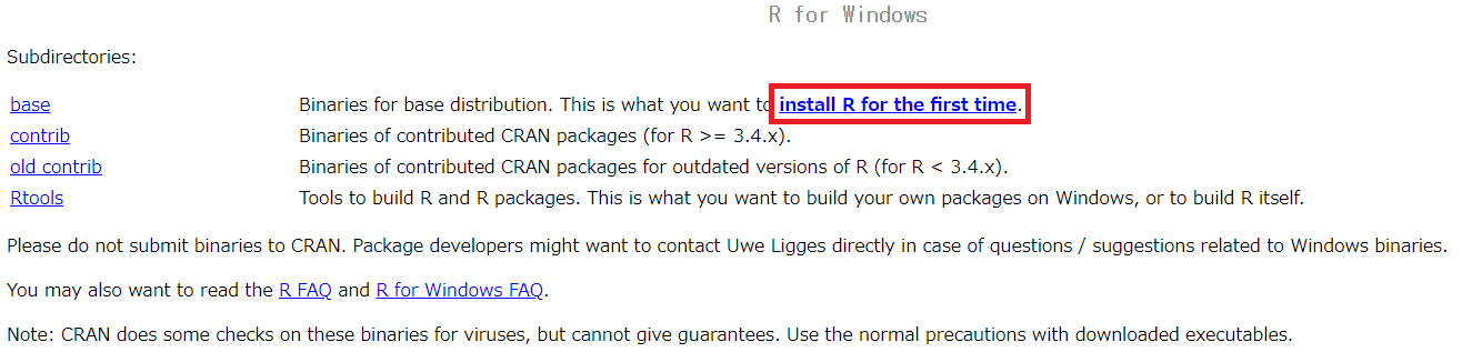 次の画面に遷移する.baseまたはinstall R for the first timeをクリックする.