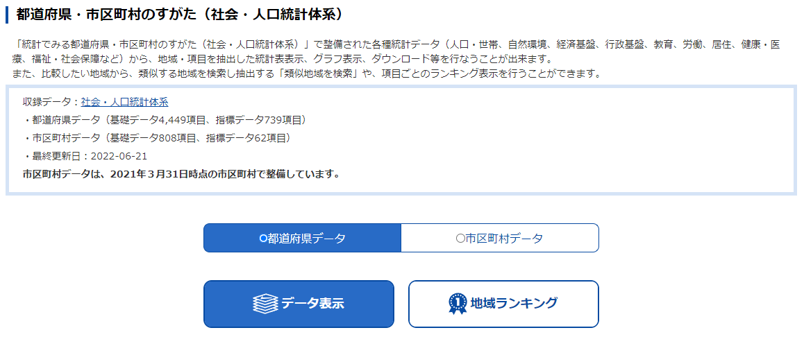 「表示項目選択」で分野を「A 人口・世帯」とし,大分類を「A1 人口の概要・構造」とし,小分類を「A11 人口」とし,「項目選択」で「A1101 総人口(人)」を選ぶ.