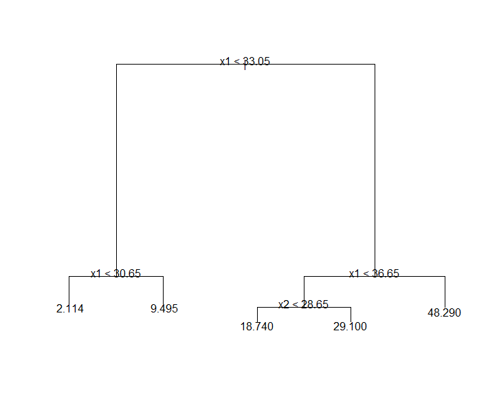 > library(tree) > z = tree(y ~ x1 + x2 + x3 + x4) > plot(z) > text(z)