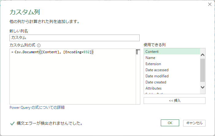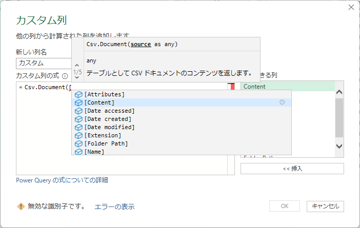 Csv.Documentを選び,([とタイプすると引数がポップアップするので[Content]を選ぶ.