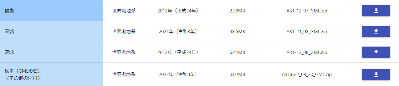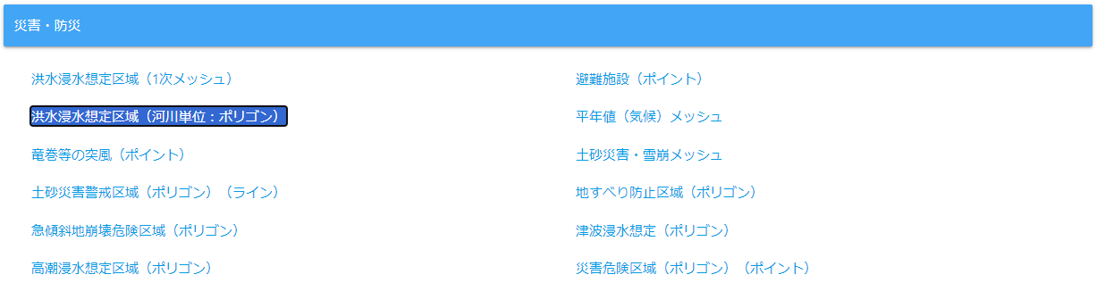 データはここにある.ブラウザで「洪水浸水想定区域」と検索する.メッシュとポリゴンが検索されるが,今回はポリゴンを使う.