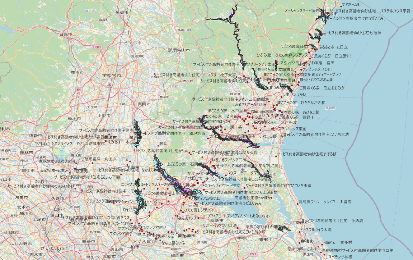 結果を示す.サービス付き高齢者住宅の中には洪水浸水想定区域の中に建っているものもある.こういう情報は自分で調べないと分からない.ハザードマップだけでは自分の関係する建物がどこにあるのか分かりにくい.各自治体の公表している情報も本来ならシェープファイルで公開してほしいものである.