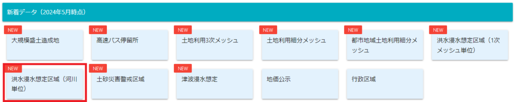 データは洪水浸水想定区域データ(河川単位)にある.「新着データ」のうち「洪水浸水想定区域(河川単位)」をクリックする.