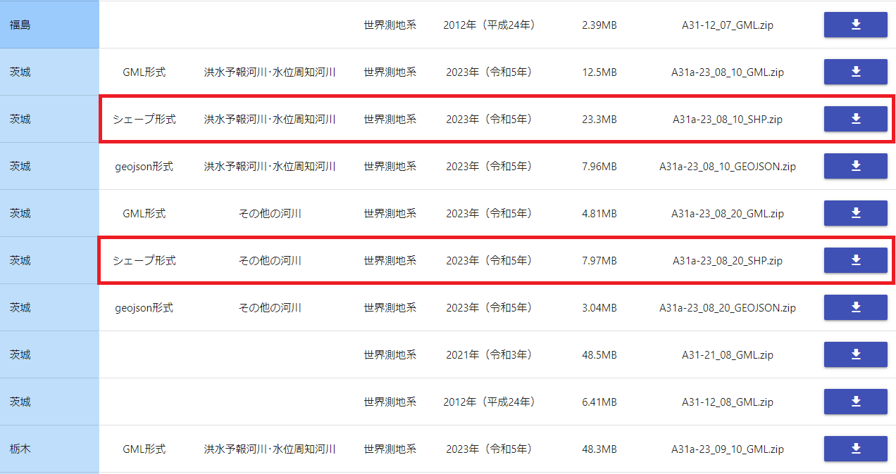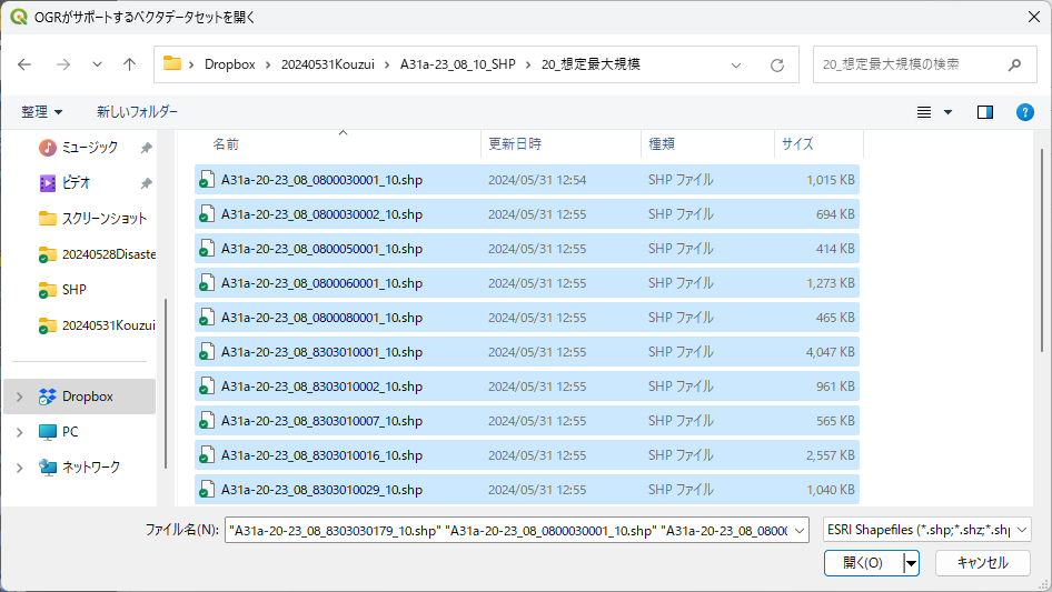 例によって「想定最大規模」のフォルダを進み,シェープファイルを選択する.ダイアログでは複数のシェープファイルを一括してダウンロードできる.