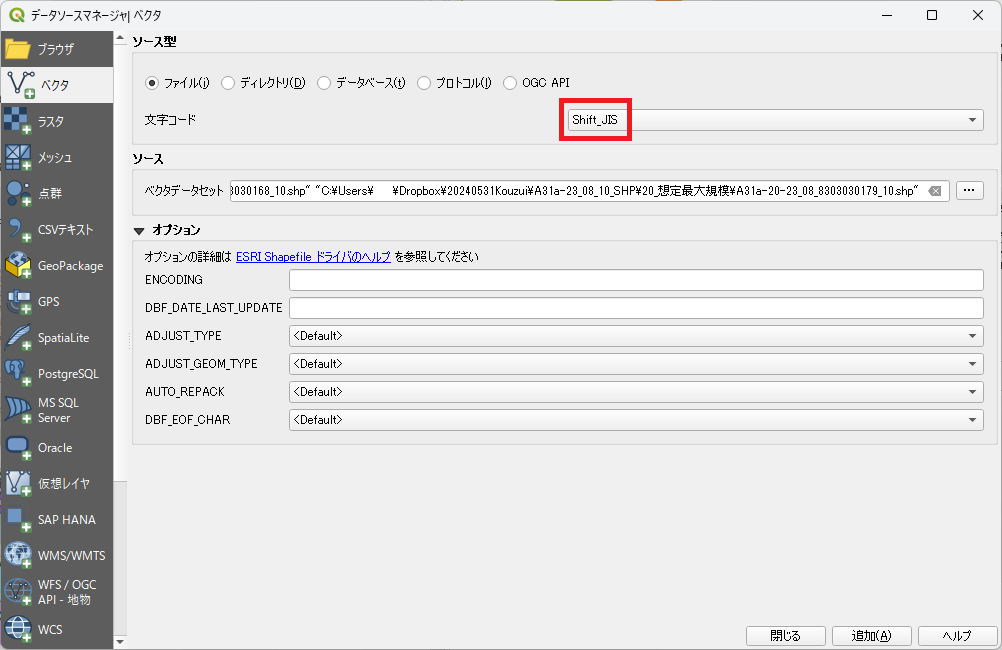 文字コードを忘れずにShift JISに変更して「追加」する.