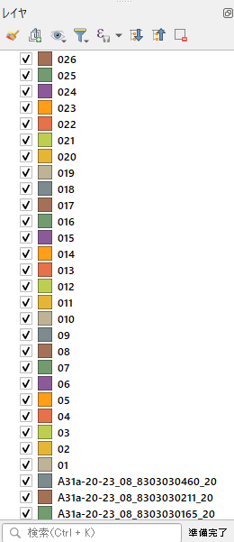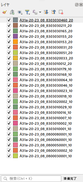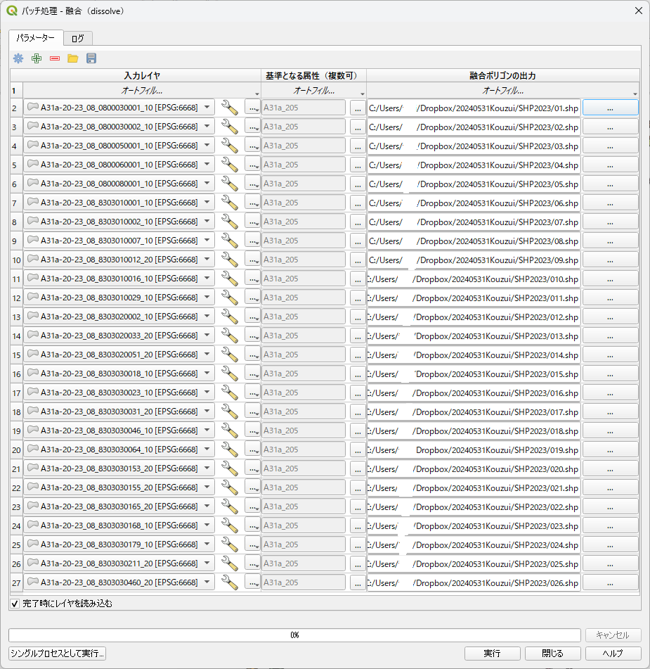 さて,これらのレイヤの属性テーブルを見てみると数千個のポリゴンデータから構成されているのがわかる.このまま塗り分けてもよいのだが,可能なら流域ごとの浸水深ランクコードごとにレイヤをオン・オフできると都合が良いだろう.そこで融合を行いたい.26個なら手動で何とかなるが,QGISにはバッチプロセスという便利な機能がある.