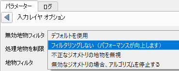 工具アイコンの「入力レイヤオプション」の「無効地物フィルタ」で「フィルタリングしない」を選ぶ.これは手動で26回行う必要がある.いささか面倒である.