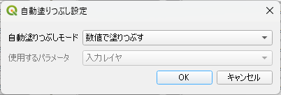 「融合ポリゴンの出力」ではフルパス+ファイル名を指定する.「…」とあるボタンをクリックするとダイアログが開くので任意のフォルダを指定し,ファイル名に1文字0を入力して保存する.なぜか1文字入力しないと保存できない仕様となっている.自動塗りつぶし設定では「自動塗りつぶしモード」を「数値で塗りつぶす」を選択する.他の選択肢ではうまくいかない.