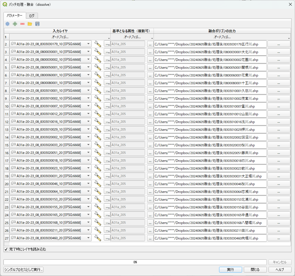 国土数値情報の洪水浸水想定区域データをQGISで表現するではバッチプロセスで属性テーブルの属性をファイル名に取り出す部分でつまづいていた.今回QGISのコミュニティで質問した結果回答が得られたので結果を公開する.