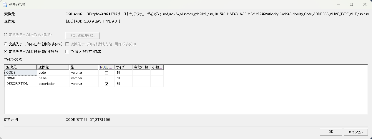 また,データ長が50を超える列が混じっており,「データソースの選択」の際に「詳細設定」で該当列のOutputColumnWidthの値を500などの大きい値に変更しておかないとインポートの最後にエラーで弾かれることになる.
