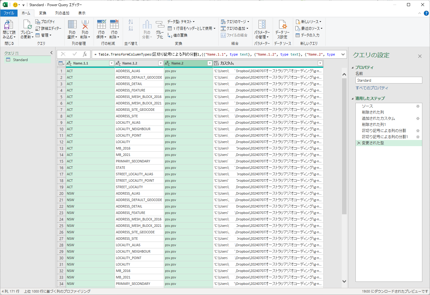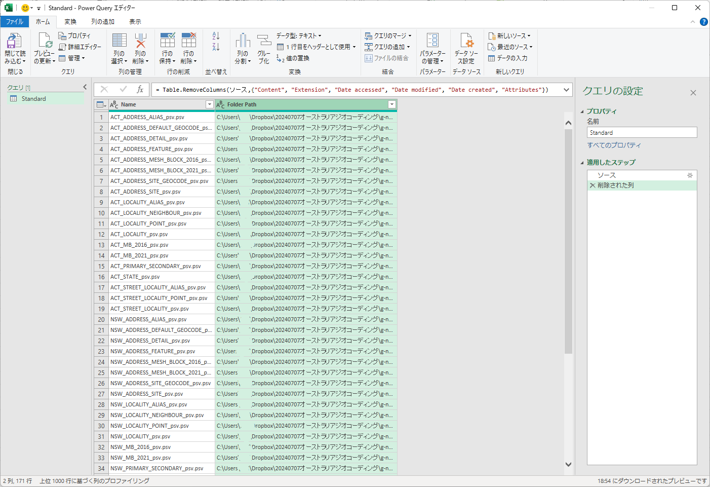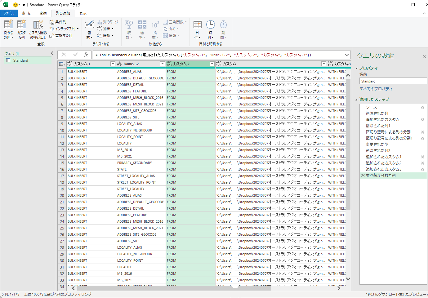 オーストラリアのGeoscape社による住所からのジオコーディングを行った.ファイルからデータベースへのBULK INSERTにより10分とかからずデータベースを構築できた.テーブル名をファイル名に含めてあり,Power Queryでのコード作成が容易であったことがその理由である.