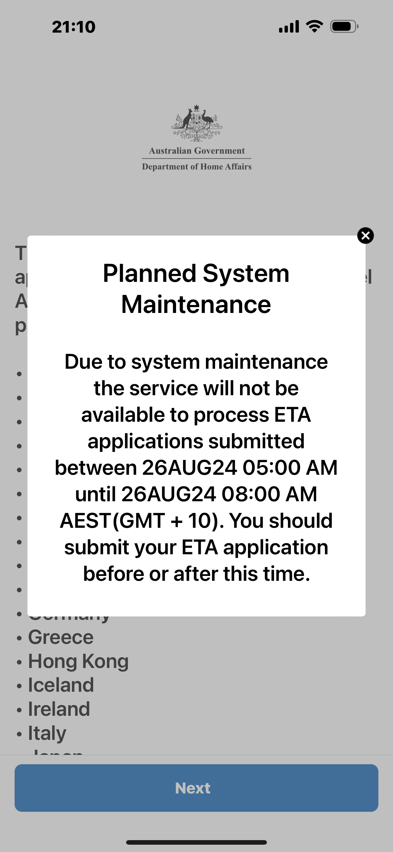 システムメンテナンスのため、26AUG24 AM 05:00 から 26AUG24 AM 08:00 ASET(GMT +10)までの間、ETA申請処理ができなくなります。ETA申請はこの時間の前後に行ってください。