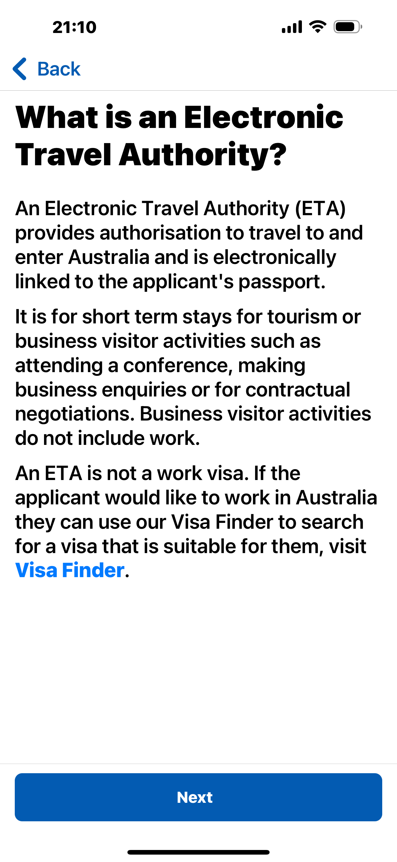 ETAは就労ビザではありません。オーストラリアで就労を希望する場合は、VISA Finderを利用して、申請者に適したビザを検索することができます。