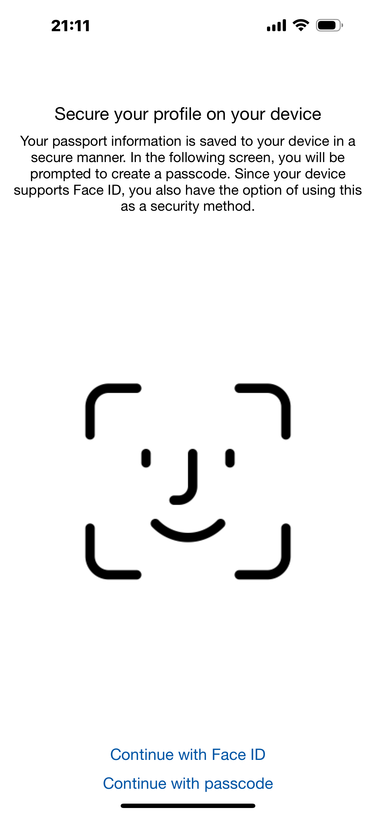 あなたのパスポート情報は、安全な方法でデバイスに保存されます。次の画面では、パスコードを作成するよう促されます。お使いのデバイスはFace IDに対応しているため、セキュリティ方法としてFace IDを使用することもできます。