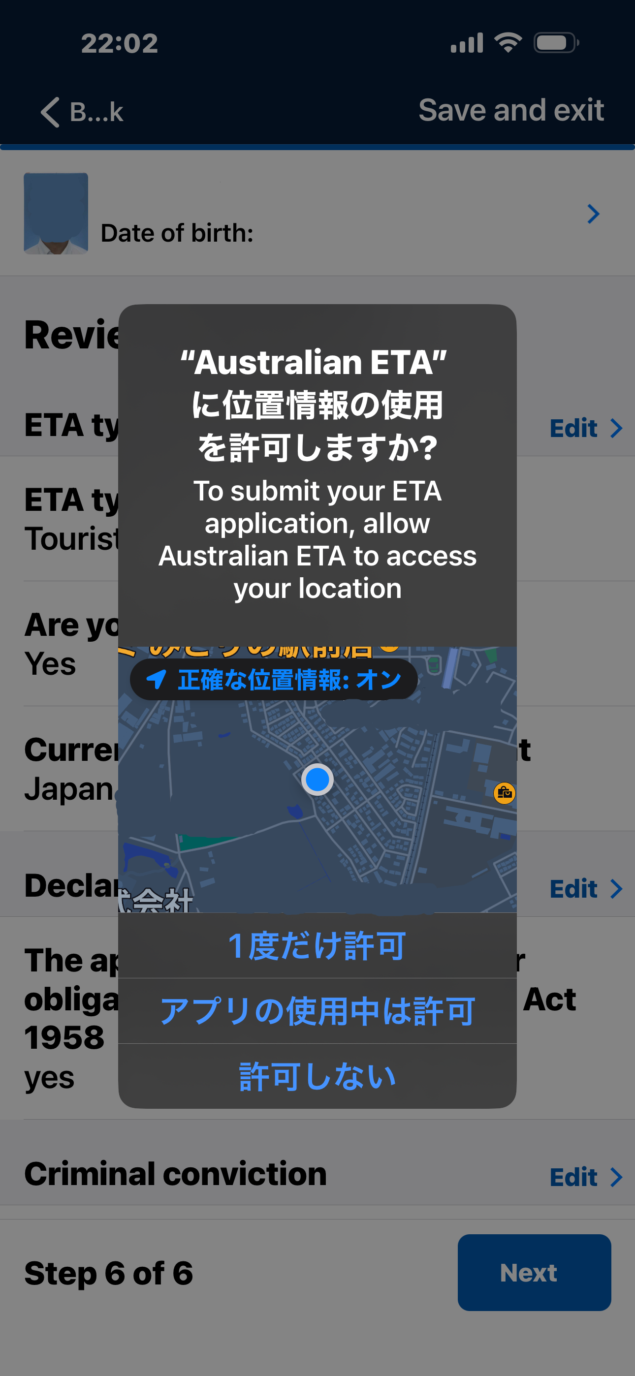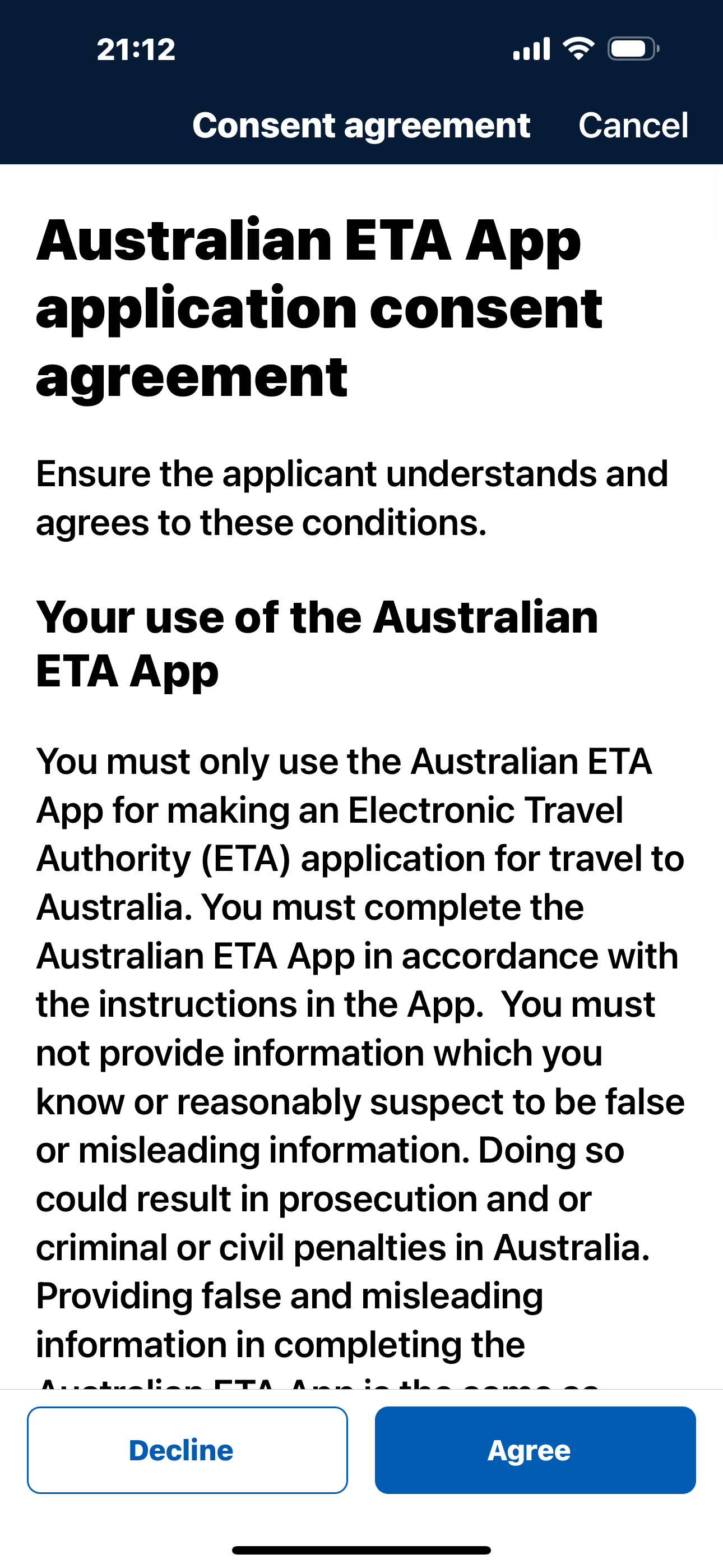 オーストラリアETAアプリは、オーストラリアへの渡航のための電子渡航認証(ETA)申請のみに使用してください。また、虚偽の情報または誤解を招くような情報であることを知りながら、または合理的にそのように疑われる情報を提供してはなりません。このような情報を提供した場合、オーストラリアにおいて訴追され、刑事罰または民事罰が科される可能性があります。