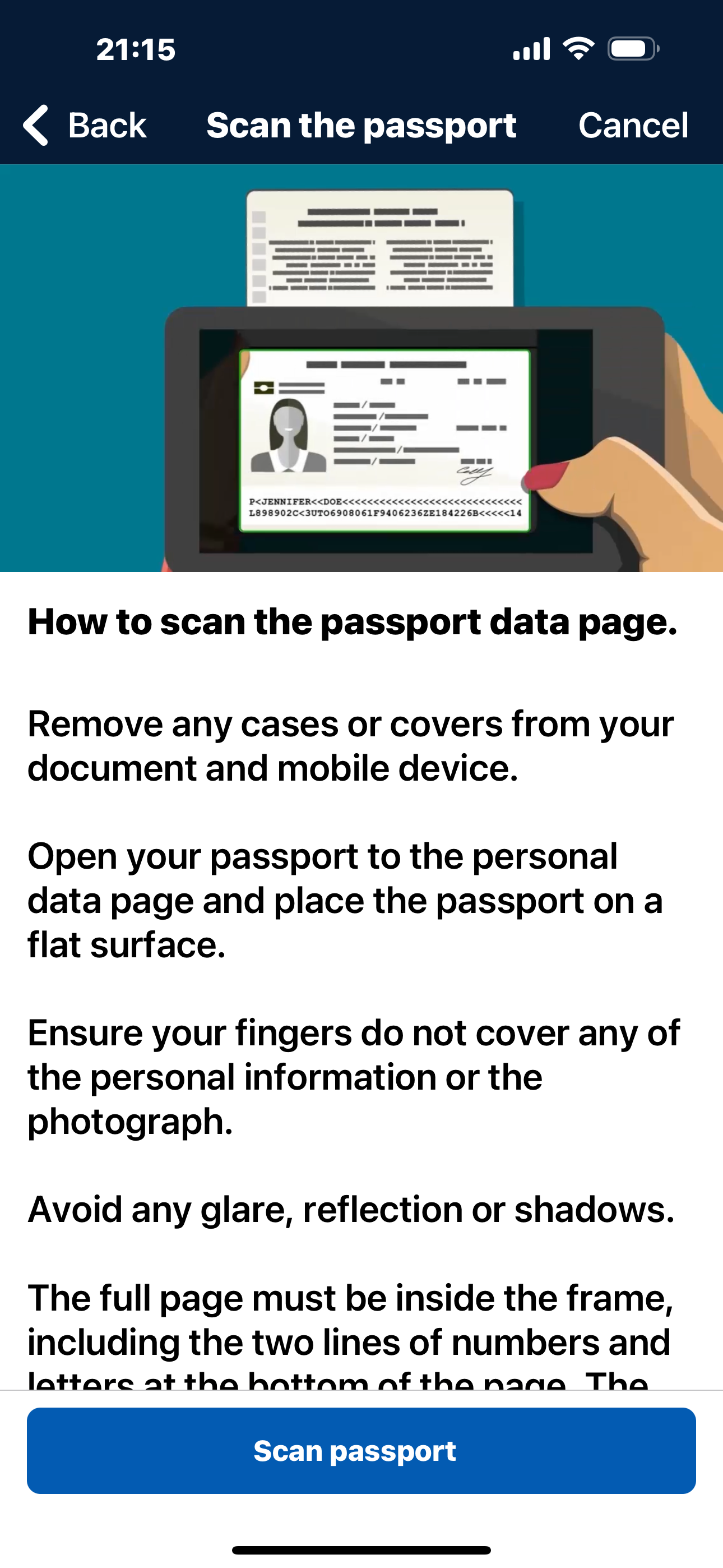 パスポートの個人情報ページの写真が撮影され、そのページとパスポートチップに含まれる情報が、申請の一部を完了する目的で使用されます。