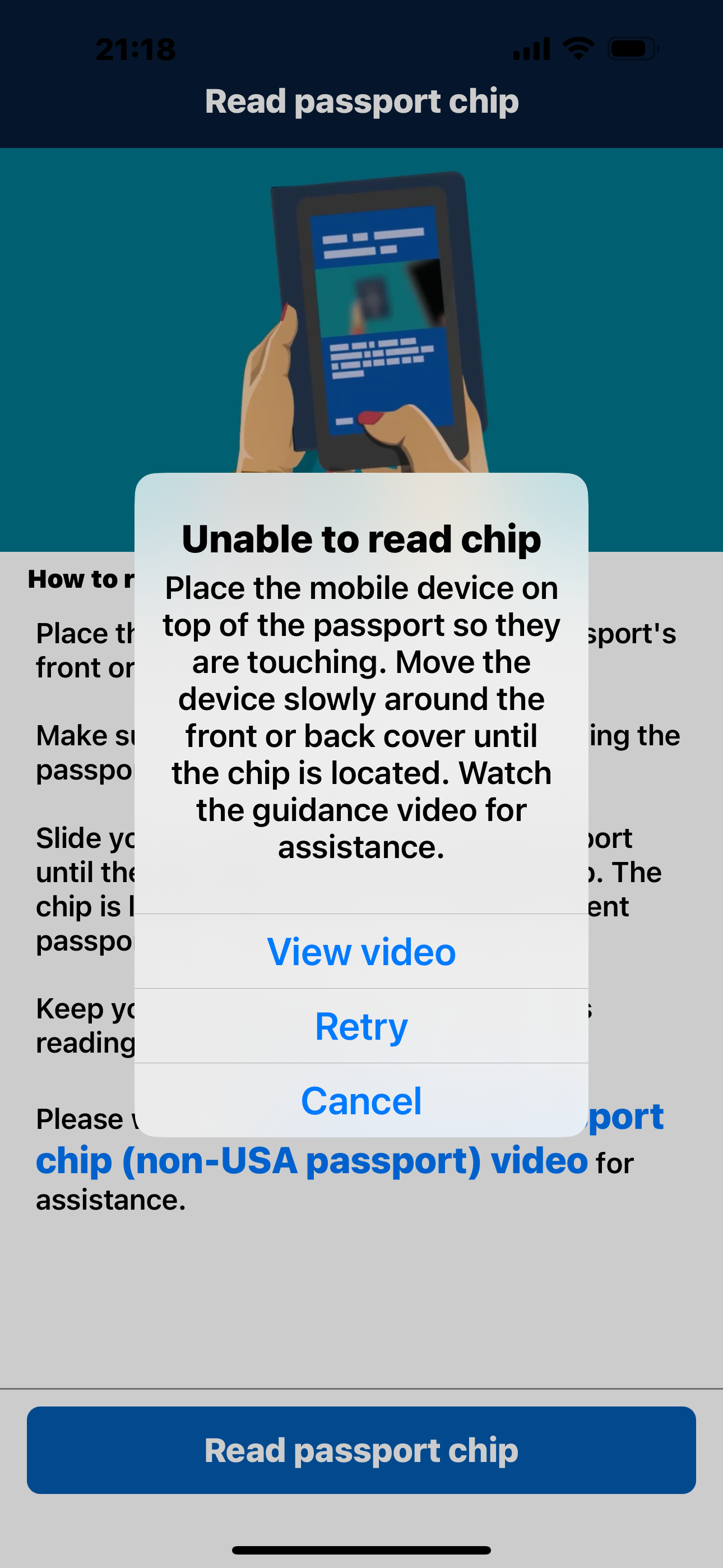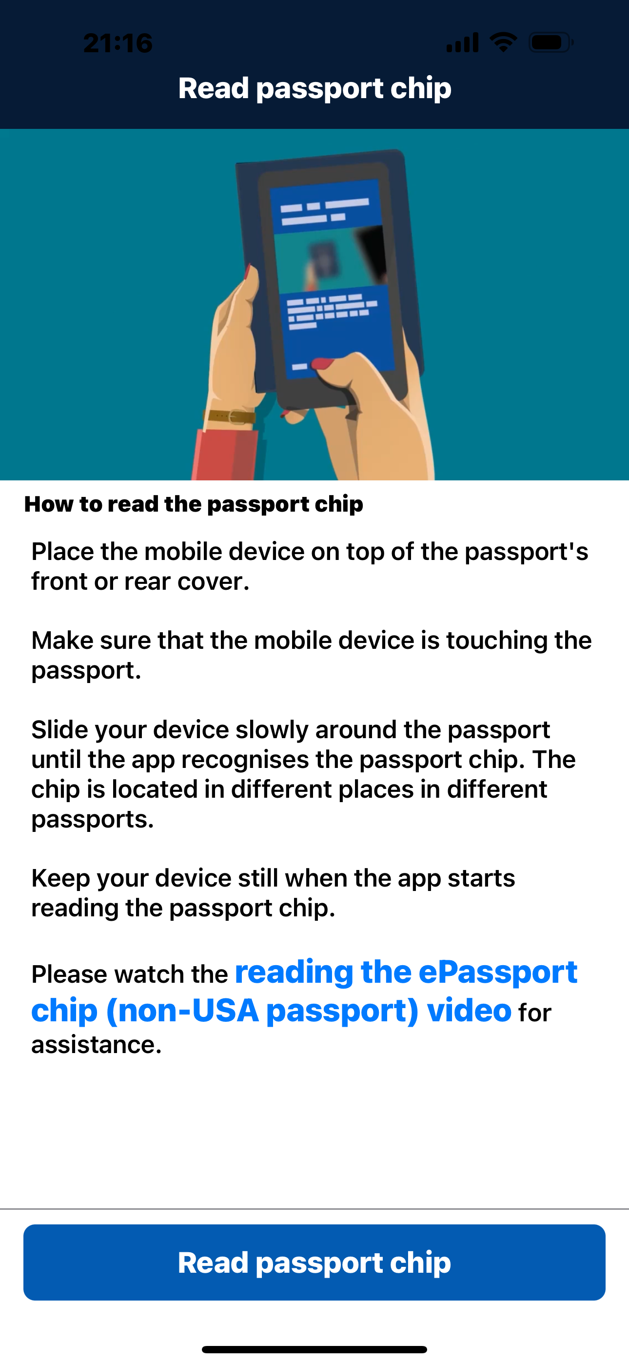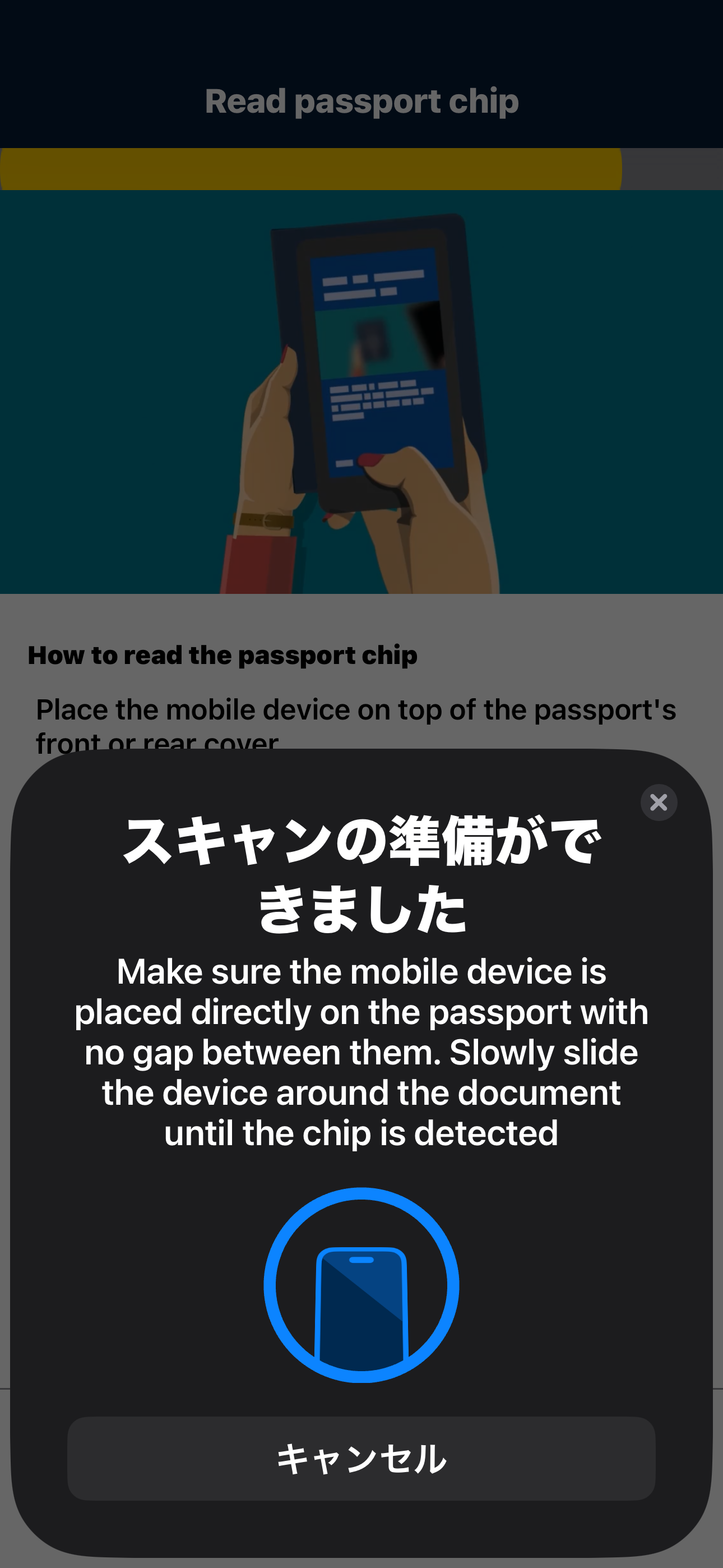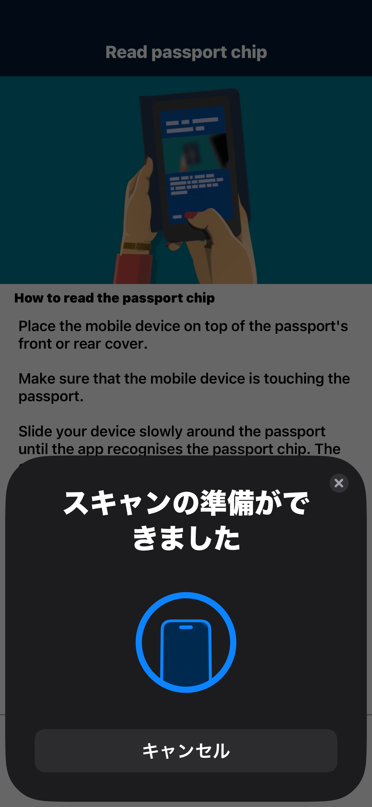 アプリがパスポートチップを認識するまで、端末をパスポートの周囲でゆっくりスライドさせてください。チップの位置はパスポートによって異なります。