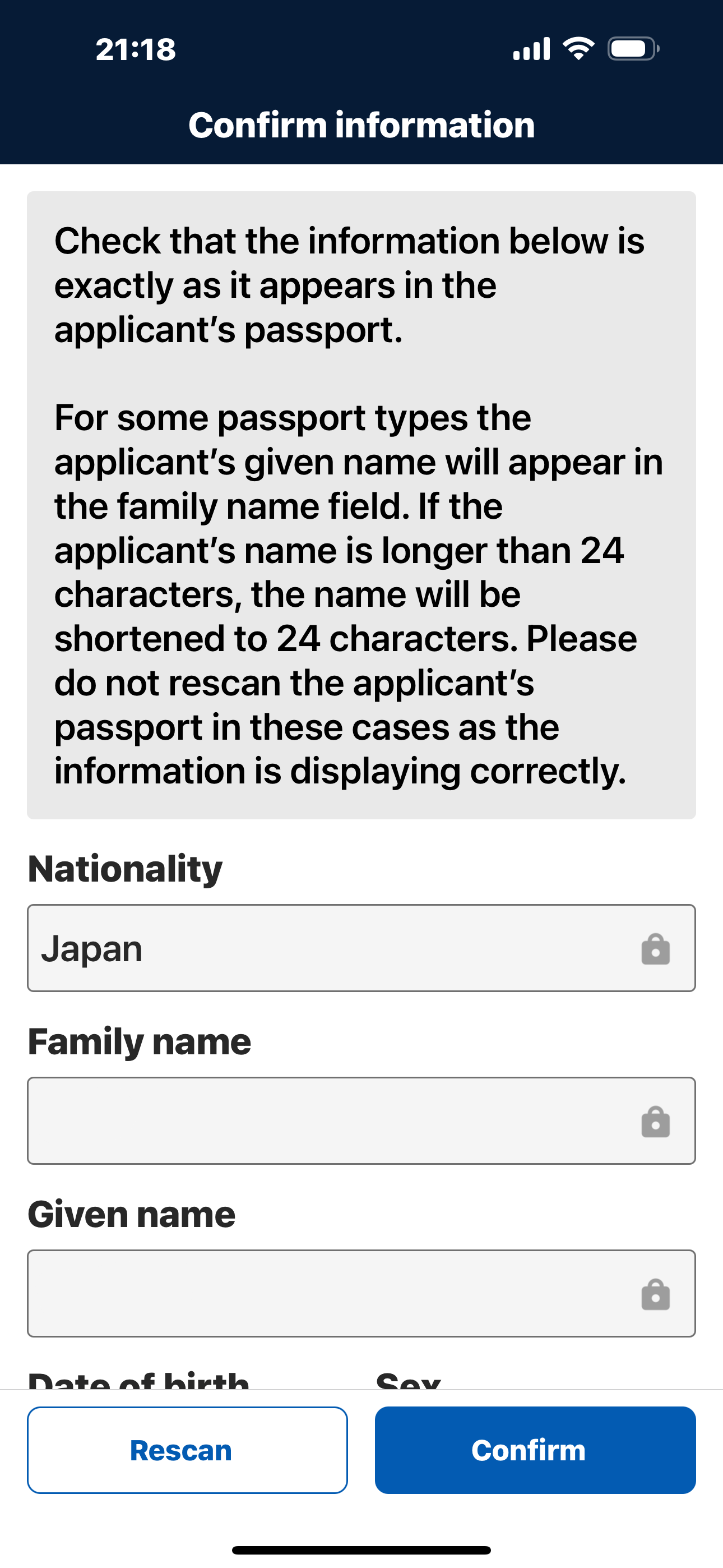 パスポートの種類によっては、姓の欄に申請者の名前が表示されます。申請者の名前が24文字より長い場合は、24文字に短縮されます。このような場合、情報は正しく表示されますので、申請者のパスポートを再スキャンしないでください。