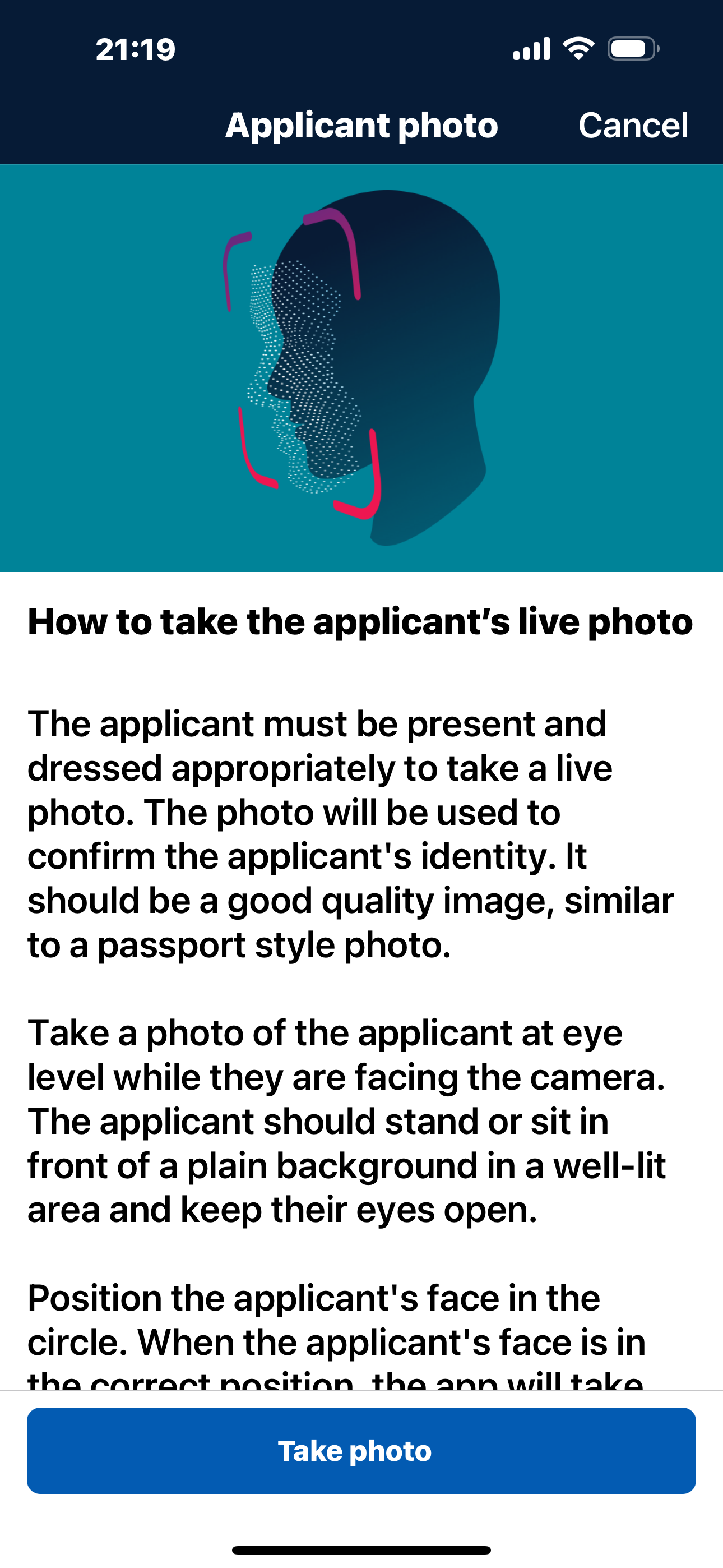 ライブ写真を撮影するには、申請者が出席し、適切な服装をする必要があります。写真は申請者の身元を確認するために使用されます。パスポート用の写真と同様の、高品質の画像である必要があります。