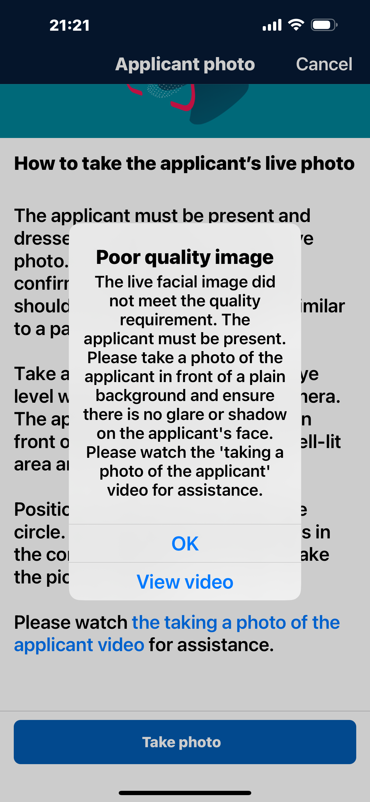 ライブの顔画像が品質要件を満たしていません。申請者が同席している必要があります。申請者の写真を無地の背景の前で撮影し、申請者の顔に反射や影がないことを確認してください。「申請者の写真を撮る」ビデオをご覧ください。