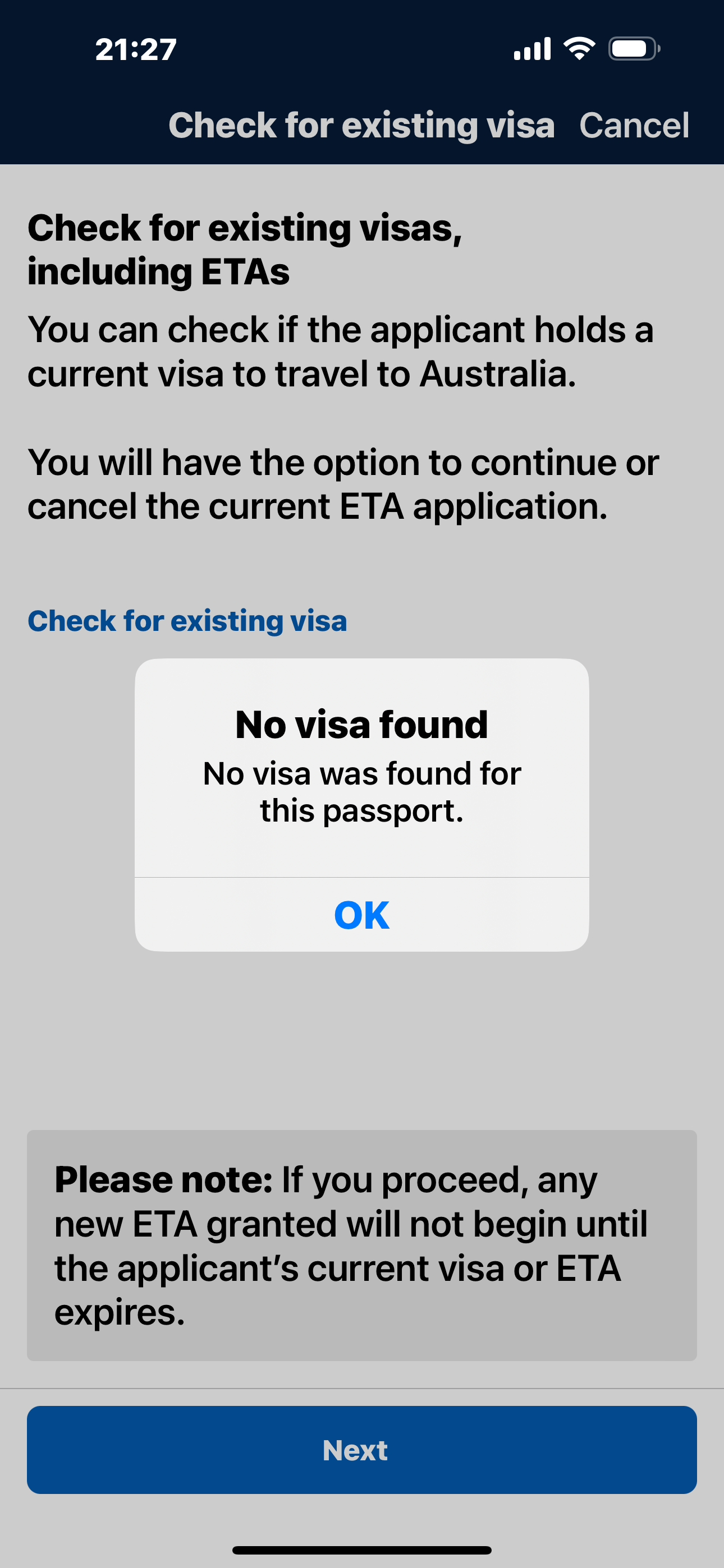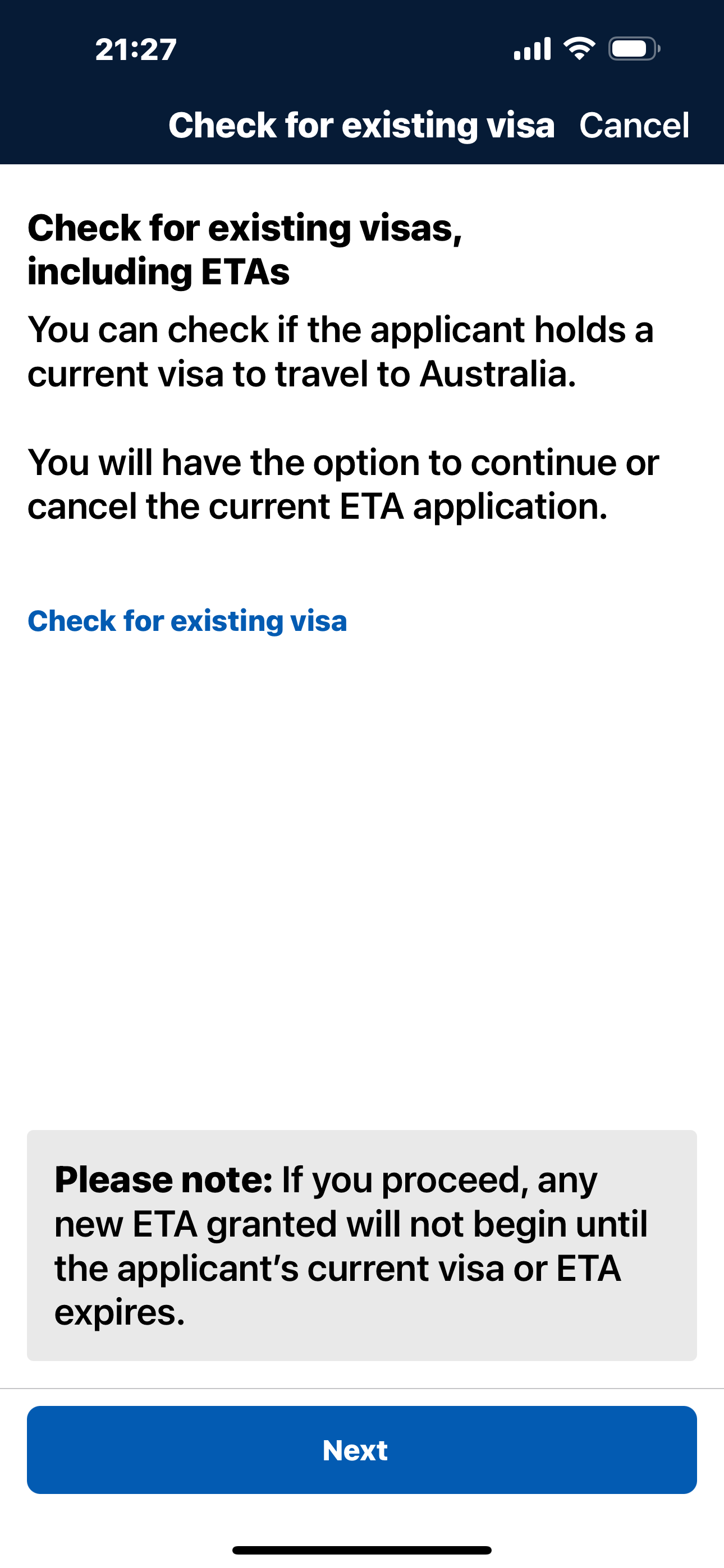 注意: 続行すると、申請者の現在のビザまたは ETA の有効期限が切れるまで、付与される新しい ETA は開始されません。