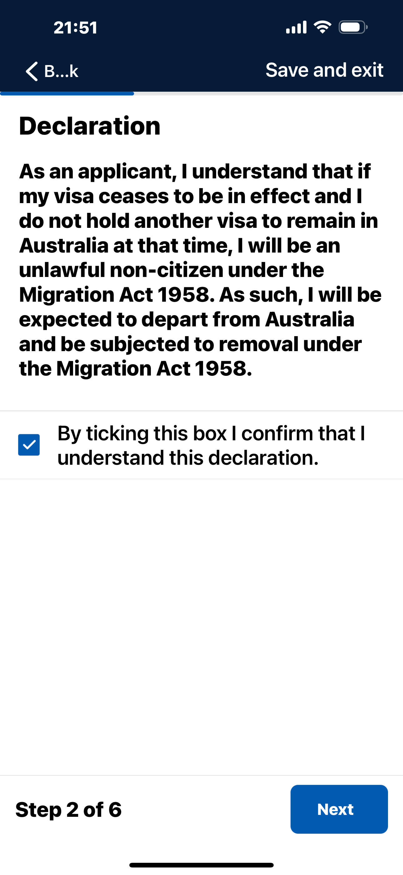 申請者として、私のビザが失効し、その時点でオーストラリアに滞在するための別のビザを持っていない場合、私は 1958 年移民法の下で不法な非市民となることを理解しています。そのため、私はオーストラリアから出国し、1958 年移民法の下で強制退去の対象となることが予想されます。