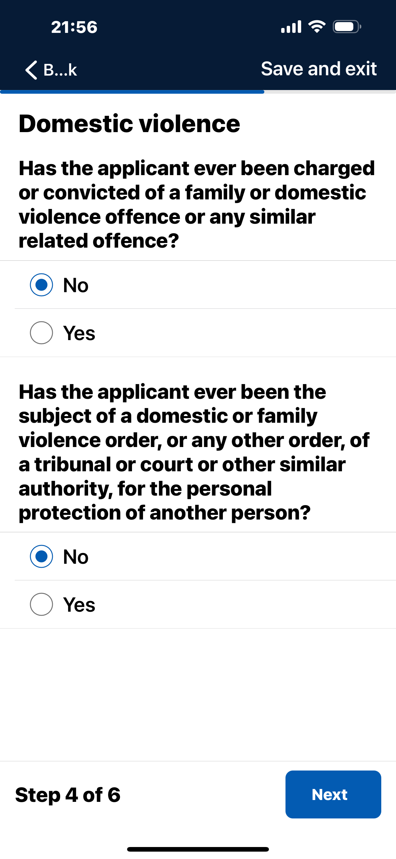 申請者は、家庭内暴力または家族内暴力の命令、または法廷や裁判所、その他同様の機関による、他人の身辺保護のためのその他の命令の対象となったことがありますか?