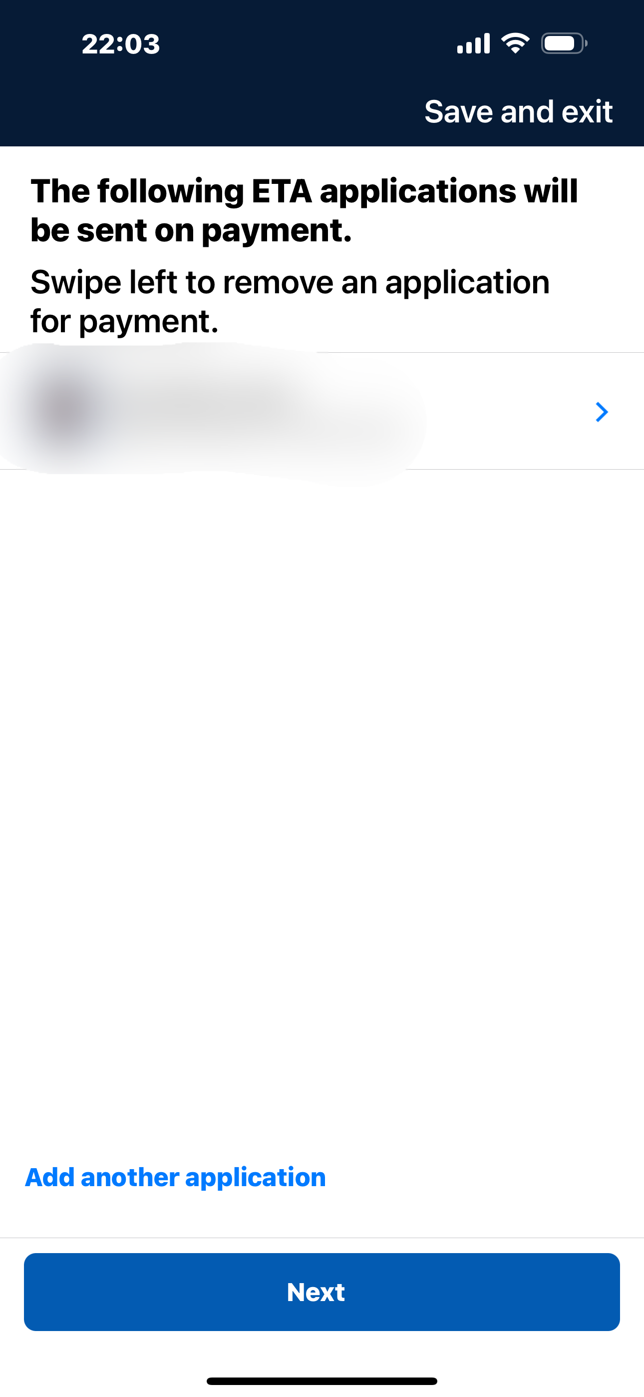 現在の ETA 申請を続行するかキャンセルするかを選択できます。