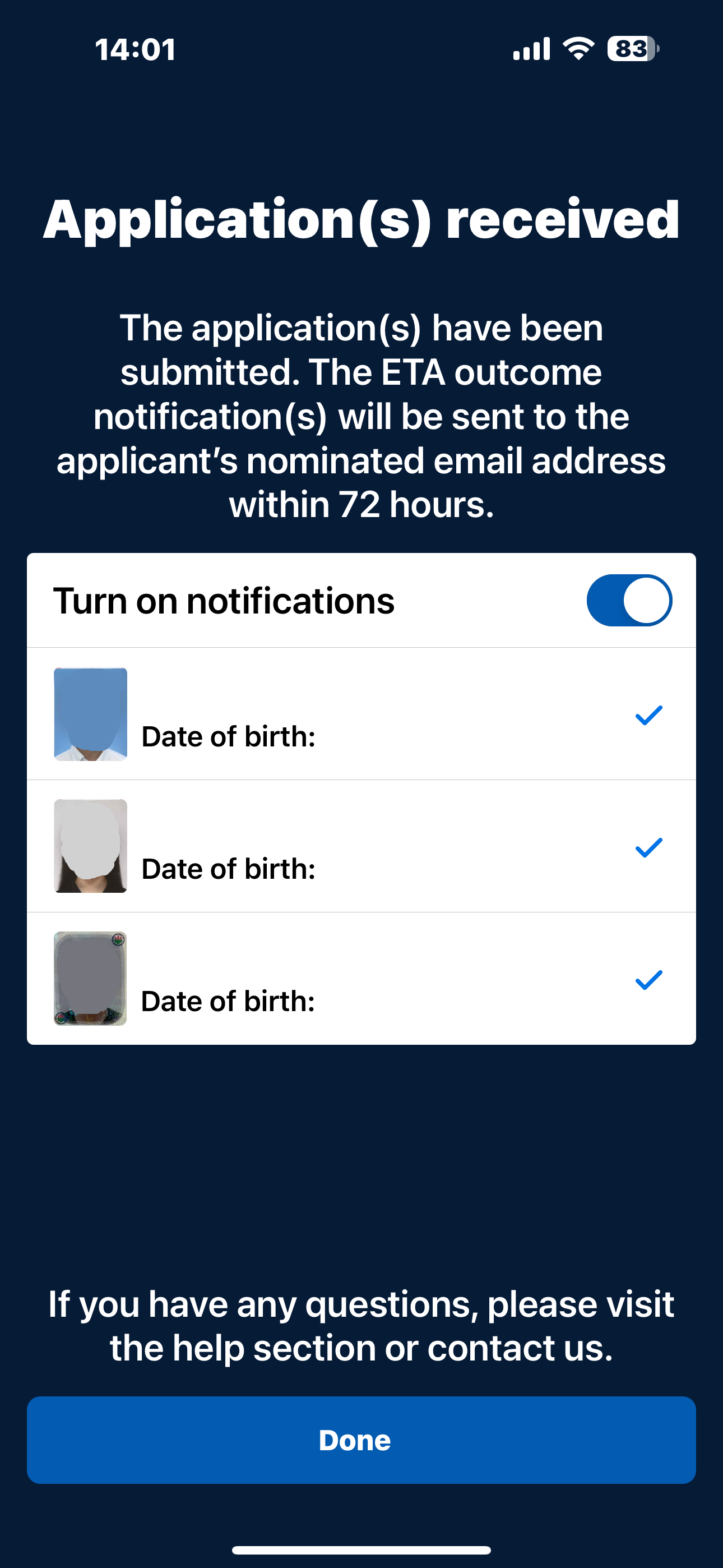 申請書が提出されました。ETAの結果通知は、72時間以内に申請者が指定したEメールアドレスに送信されます。