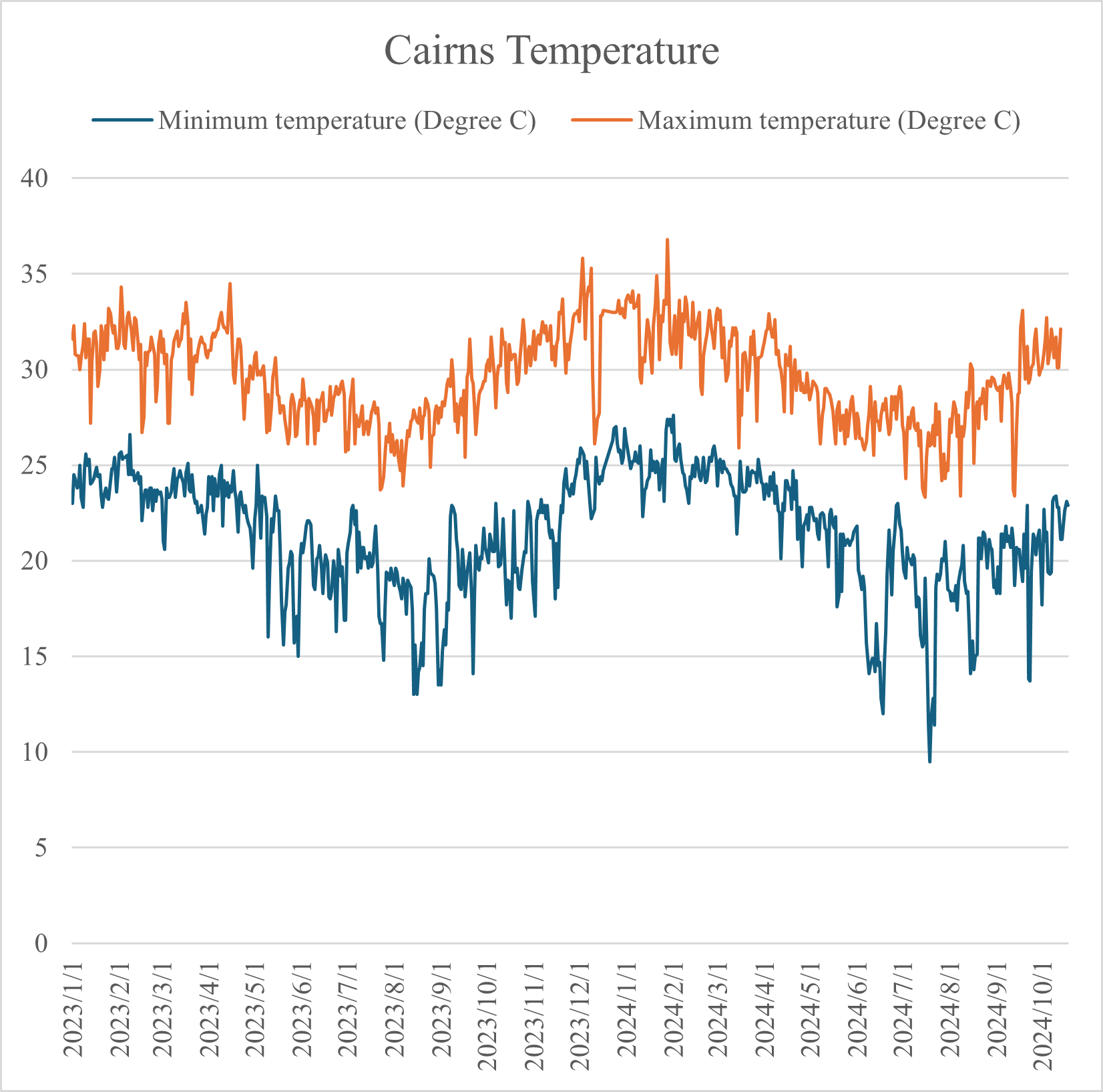 日本の気象データをダウンロードするには気象庁のホームページに行けば良い.オーストラリアの気象データをダウンロードするにはAustralian Bureau of Meteorologyに行けば良い.今回,ケアンズの最高気温と最低気温をダウンロードして図示することにした.