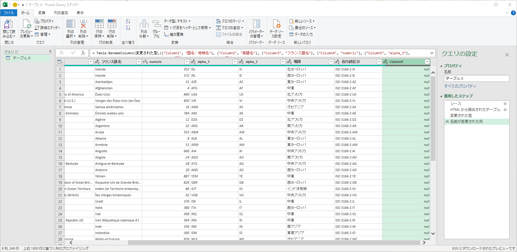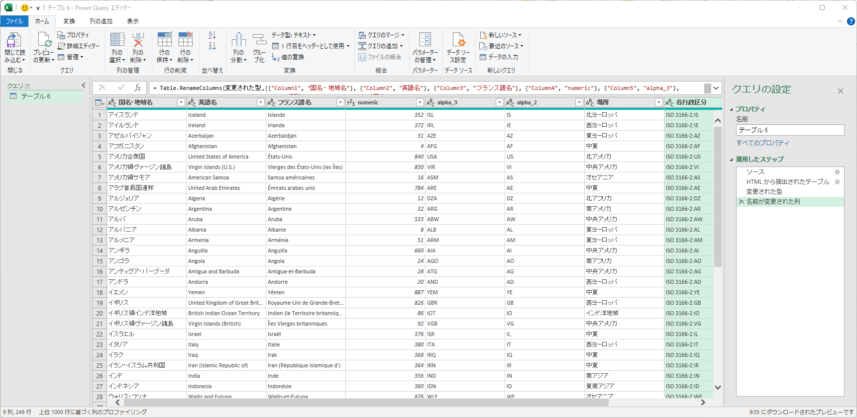 「詳細設定」で「国・地域名」「英語名」「フランス語名」のOutputColumnWidthを50から500に拡張しておく.予想以上に長い国名がある.