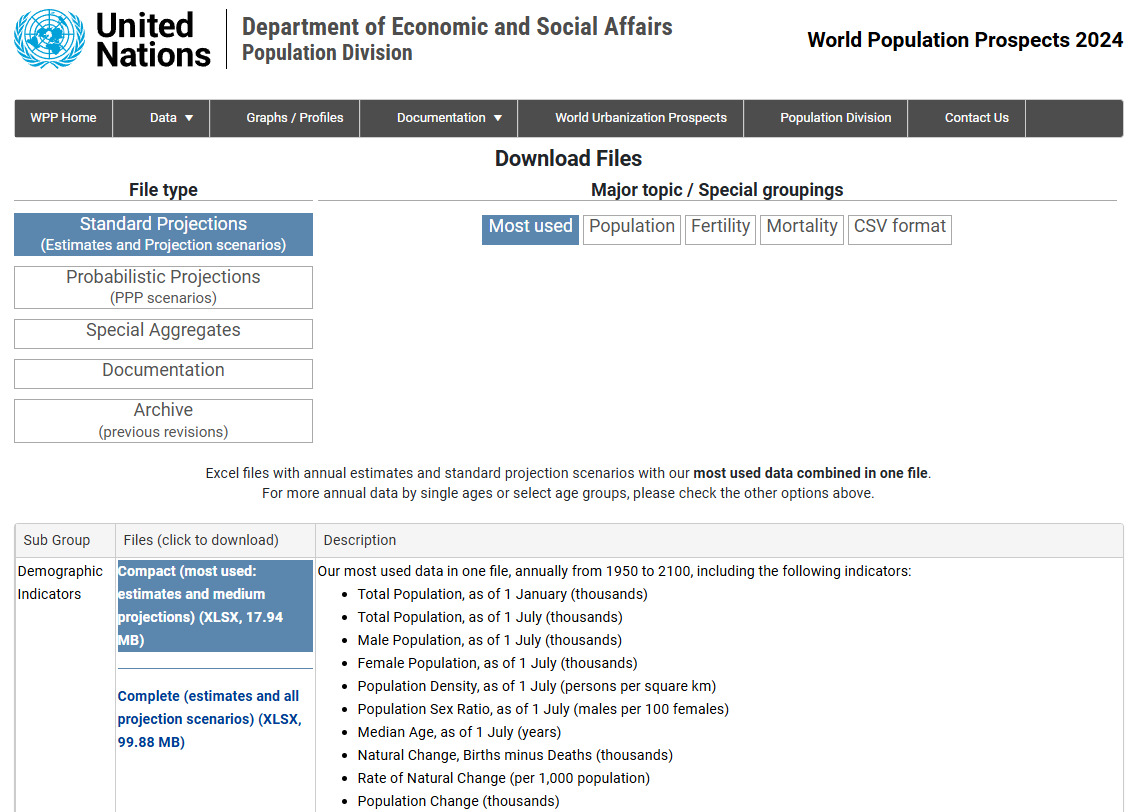主要出典資料名一覧のページが表示される.最初のWorld Population Prospectのリンクをクリックする.