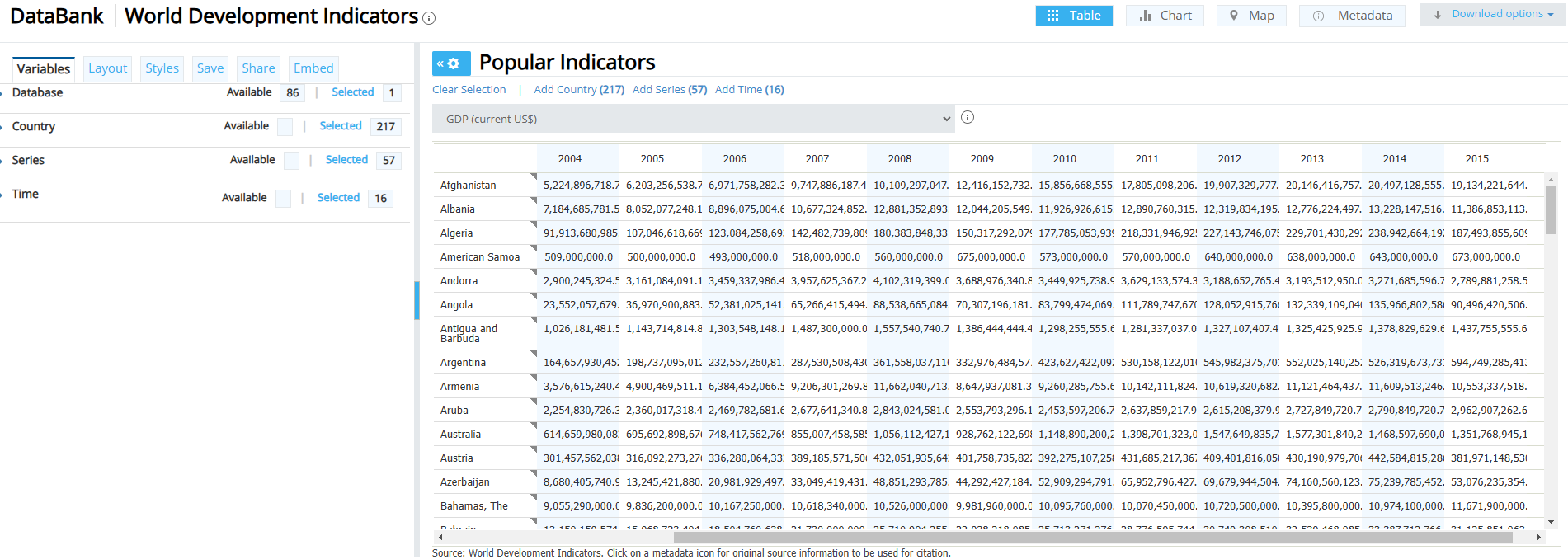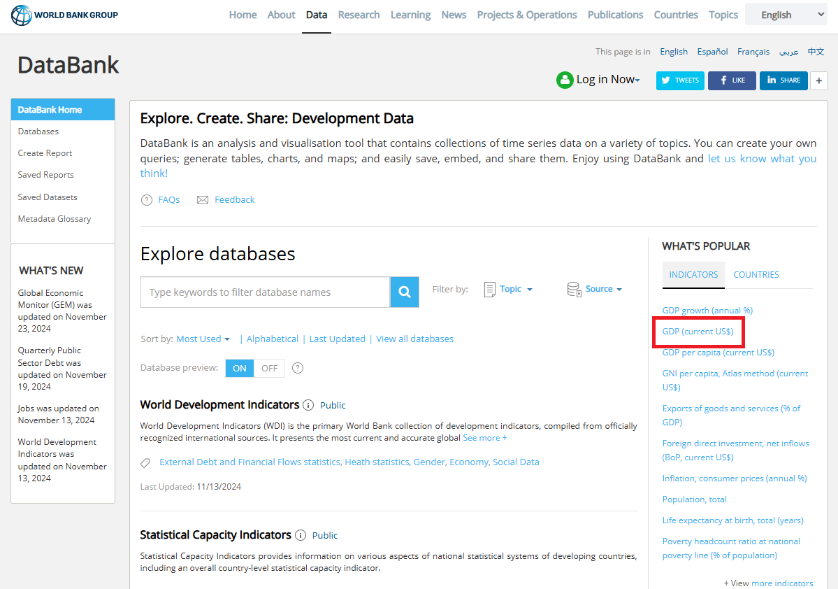 世界銀行のDataBankからGDP(current US$)をクリックする.