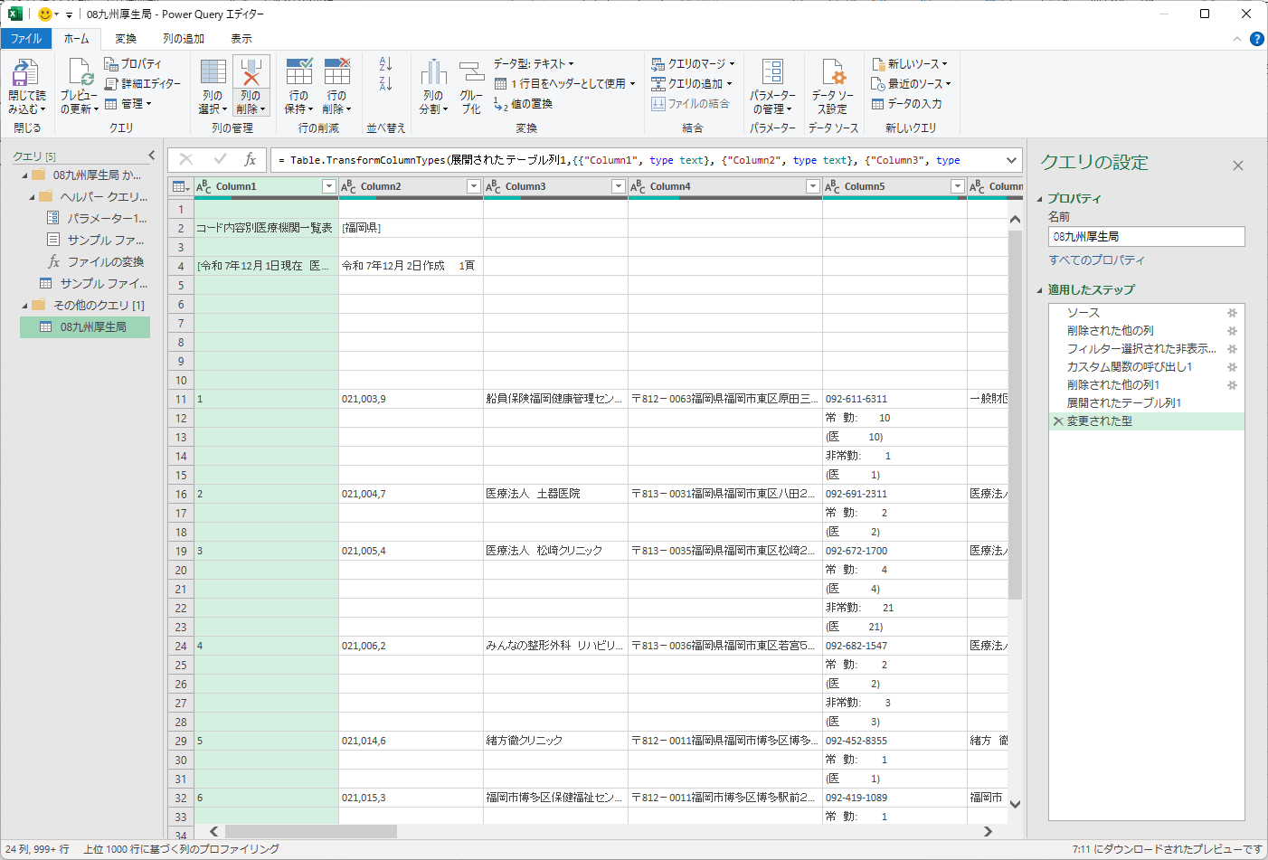全国の地方厚生局のサイトにある各医療機関の診療科名を取得し,第一正規形にした.Power Queryだけでは対応しきれず,VBAによる処理が必要であった.最終的な件数は484,435行であった.医療機関数は156,045行であった.データは2026年1月時点のものである.
