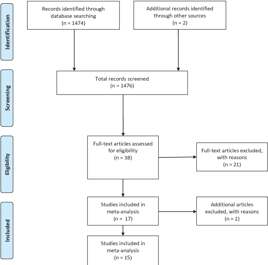 文献検索は英語のみ,データベースは PubMed, Sports Discus, CINAHL からで,検索語句は ‘muscle’, ‘hypertrophy’, ‘growth’, ‘cross sectional area’, ‘fat free mass’, ‘resistance training’, ‘resistance exercise’, ‘multiple sets’, ‘single sets’, ‘volume’, ‘dose response’ とした.1476 件の文献がスクリーニングされ,最終的に 15 件が残った.