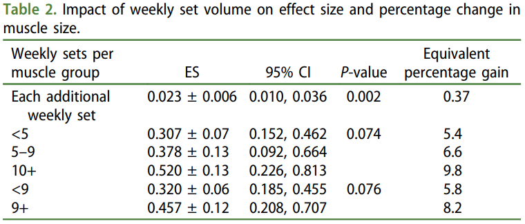 筋肉量を最大化するには最低でも週に 10 セットを要することが明らかになった.しかし筋肥大には適応が存在すると考えられ,恐らくオーバートレーニングによってプラトーになる上限が存在すると考えられるが,この論文ではその上限を示すことはできなかった.