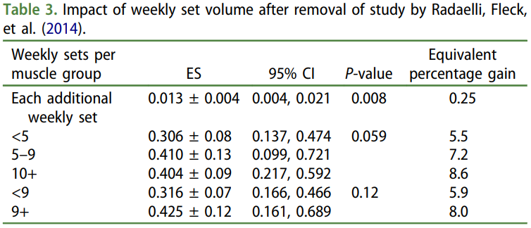 感度分析において,一つの研究が非常に影響力が強いことを示している.Radaelli, Fleck らの研究を除外してみると,追加 1 セットあたりの効果量のインパクトが 0.013 に減少し,これはパーセント増加率にして 0.25 % に該当する.