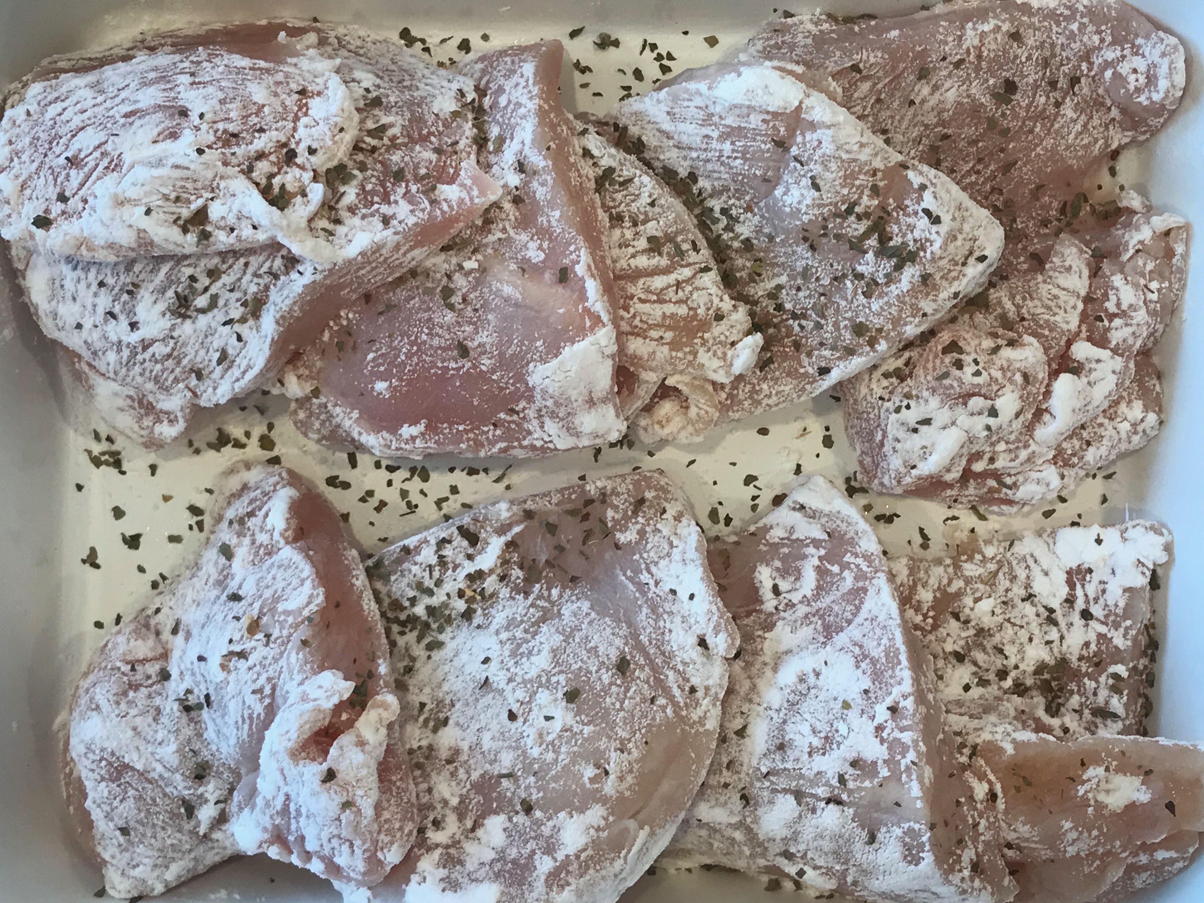 2枚におろしてコーティングの粉をまぶした状態