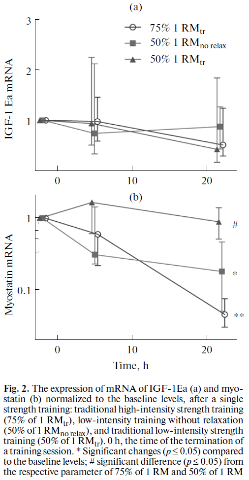 Effects of high-intensity strength training and low-intensity strength training without relaxation of muscles on the expression of genes regulating myogenesis.