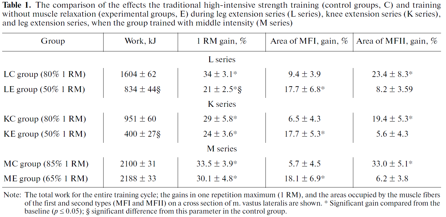 80-85% 1RM (対照群, KC 群)の強度による伝統的筋力トレーニングの効果を弛緩なしの 50% 1RM 低強度トレーニング群(介入群, KE 群)と比較した.10 週間のトレーニングサイクル期間における KC 群と KE 群の総仕事量の違いは 2 倍以上になった (Table 1). 同時に,膝伸展筋の 1RM の増加に違いは見られず, KC 群と KE 群でそれぞれ 29%, 24% であった (Table 1).