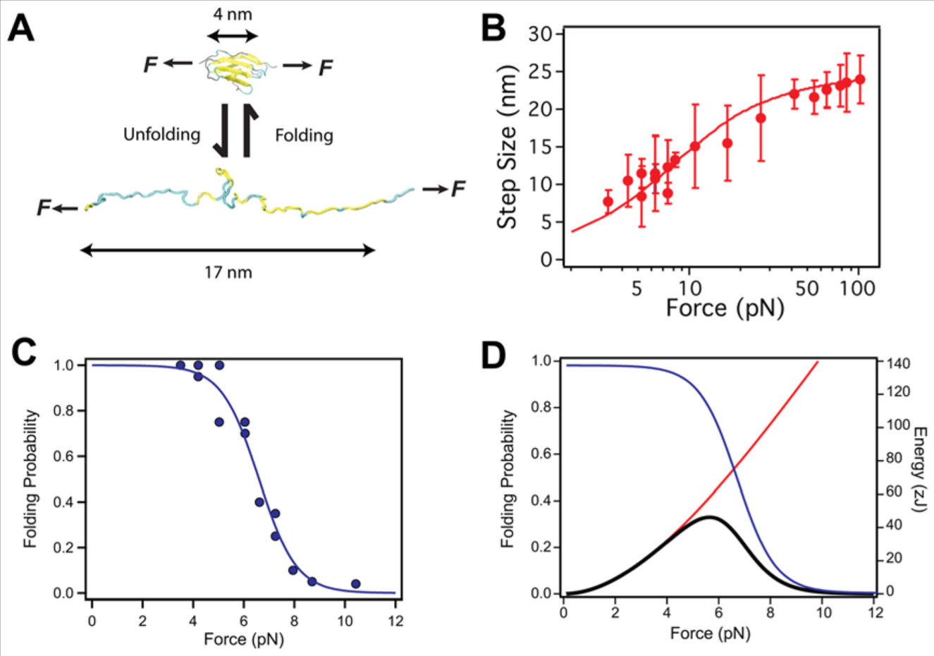 (A) 機械的張力の下での Ig ドメインのアンフォールディング,再フォールディング. 6 pN までの牽引力の下では, Ig ドメインは,ポリマー物理学のスケーリング則に従い,平衡状態でアンフォールディングおよび再フォールディングし,約 13 nm 伸長または短縮する. (B) アンフォールディング・再フォールディングの間に I10 および I91 のタイチン Ig ドメインの力の関数として測定されたステップサイズの大きさ.ステップサイズの依存性は, Kuhn 長 lk = 0.9 nm, 輪郭長 Lc = 25 nm の自由結合鎖モデル(実線)でよく記述できる. (C) 所与の牽引力で,折り畳まれたドメインの平衡分画(青い円)から計算された, Ig ドメインのフォールディング確率.タイチン Ig ドメインは, 4 pN の低い力でアンフォールディングし, 10 pN の高い力でフォールディングすることができる.そのデータは, 6 pN までの中間点を有するシグモイド関数(実線)によってよく表すことができる. (D) タイチン Igドメインのフォールディングにより生成される予想される仕事は,フォールディング確率(青線)と、フォールディング収縮によって行われた仕事(赤線)との積として得られ,ステップサイズに適合するよう用いた自由結合鎖モデルの数値積分から得られる.タイチン Ig ドメインは 5.7 pN で 46 zJ のピーク仕事を生成し,それはミオシンモーターにより供給されるエネルギーに匹敵する.