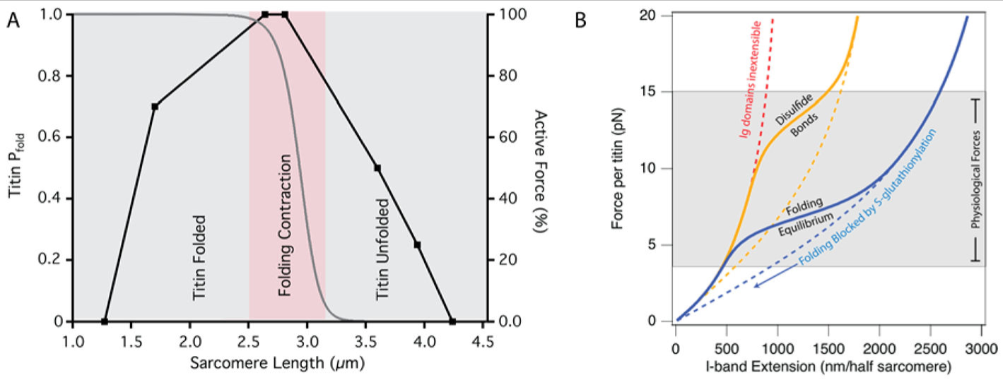 (A) ヒトの骨格筋(黒い曲線)のアクティブフォース対サルコメア長の関係 (91) は,中間長のタイチンアイソフォームを有する仮想の筋肉について,タイチンのフォールディング確率とサルコメア長の関係(灰色の曲線)と重なる.ここで,アクティブフォースが最大となる範囲では,フォールディング確率が急激に 0 から 1 に変化し,筋収縮力が大きく増大する.アクティブフォース曲線の上昇局面では,タイチンは折りたたまれたままであり,約 2.5 μm 未満のサルコメア長で力の発生に寄与することができない.下行局面では,3.1 μm よりも大きいサルコメア長ではフォールディングがほとんどないため,タイチンは主にエントロピー反動復元力を提供する.すべての筋肉がアクティブフォース対サルコメア長の関係で動作するわけではないので,各筋肉群は,その特定の筋肉群の作動範囲に入るように,選択的にスプライスされたタイチンアイソフォームを有する可能性が高い (87). (B) タイチン I-band が多くの離散 Ig ドメインに分節化していることは,特別な材料特性を付与する.正常な生理的条件下(固体の青色の曲線)のタイチンは, 4-15 pN (灰色の陰影領域)の生理学的な力の範囲内でその Ig ドメインのフォールディングおよびアンフォールディングを経験する.フォールディング反応を完全に阻止することにより,タイチンのフォールディング確率,ひいては弾力特性を変えることができる(例.S-グルタチオニル化,青色の破線曲線).酸化的ストレスまたは酵素を介した分子内ジスルフィド結合の導入は,フォールディング反応が起こる力を増加させる(金色の曲線).小分子またはシャペロンの結合は,タイチンの機械的安定性を増加させ, Ig ドメインをより伸展不能にし,タイチンの全体的な剛性を増加させる(赤色曲線破線).実際に、タイチンの弾力性はこれらの曲線のすべての混合物であり,筋肉の代謝状態に依存する.