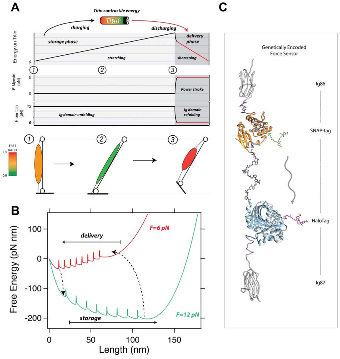 (A) 筋収縮におけるタイチンフォールディング・アンフォールディングの役割(パネル上部). タイチンドメインは「バッテリー」として機能し,収縮エネルギーをアンフォールディングにより蓄え,フォールディングの短縮時に供給する.筋肉が伸展する時,機械的張力が増加し,タイチンドメインがアンフォールドする(蓄積フェーズ (1)-(2)). 筋肉が収縮すると、ミオシン頭部が従事してタイチンにかかる力が 6 pN に低下し, Ig ドメインが再フォールディングして短縮し,収縮エネルギーが供給されて筋収縮を補助する (3)(下部パネル).運動中の動物の筋肉の伸張-収縮のための簡略化されたモデル,フォールディングおよび再フォールディング時の三相のタイチンを示す.(B) タイチン補助の筋収縮の自由エネルギー景観解釈.伸展フェーズにおいてはその景観は増加する力によりアンフォールド状態(より長い長さ)に傾き (12 pN, 青色), タイチンは収縮エネルギーをそのドメインのアンフォールディングにより蓄積する.ミオシンモーターが参加する時,タイチンにかかる負荷は 6 pN に減少するため,その景観は折りたたまれた状態に有利となり,自由エネルギー障壁を乗り越えてドメインを折りたたむことが可能となり,分子全長を短縮して収縮の仕事を提供することが可能となる.(C)この仮説を試験するには,遺伝的にコード化された力学センサーをタイチン配列に組み込むことが必要である.このような設計の一つは,エキソン I86 と I87 との間に導入された HaloTag および SNAP タグ共有標識技術を利用して提供される.仮説的な緑色供与体蛍光団および赤色アクセプター蛍光団を用いて,パネル (A) に示される歩みを通して,筋肉の FRET 比は最大から最小に変化する.これは生体内でのタイチン 1 分子あたりにかかる力を直接読み出すことを可能とする.