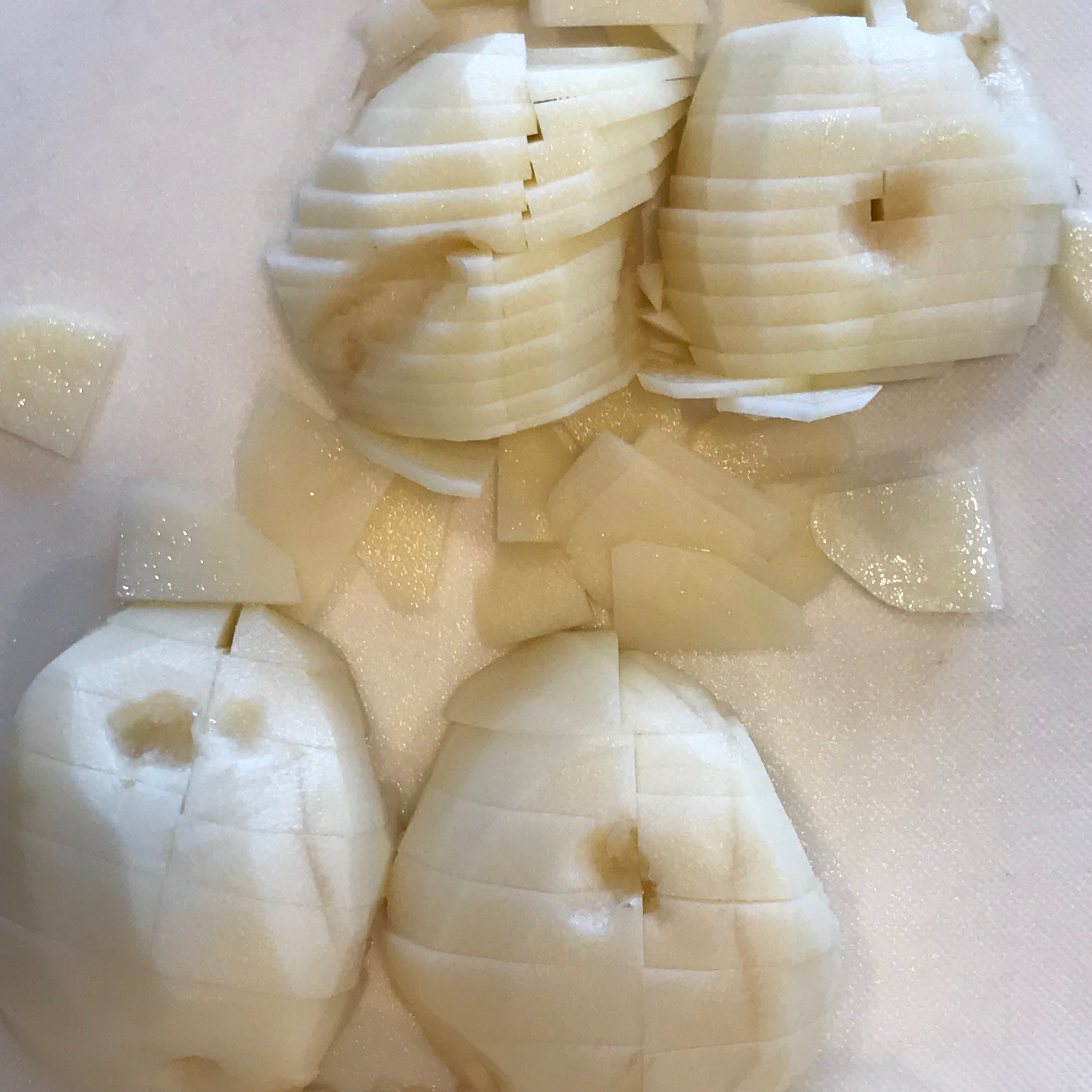 じゃがいも 2 個のうち, 1 個は特殊な切り方をする. 1 mm 厚ほど,包丁で切れるギリギリの薄さに刻む.他は通常通りで良い.