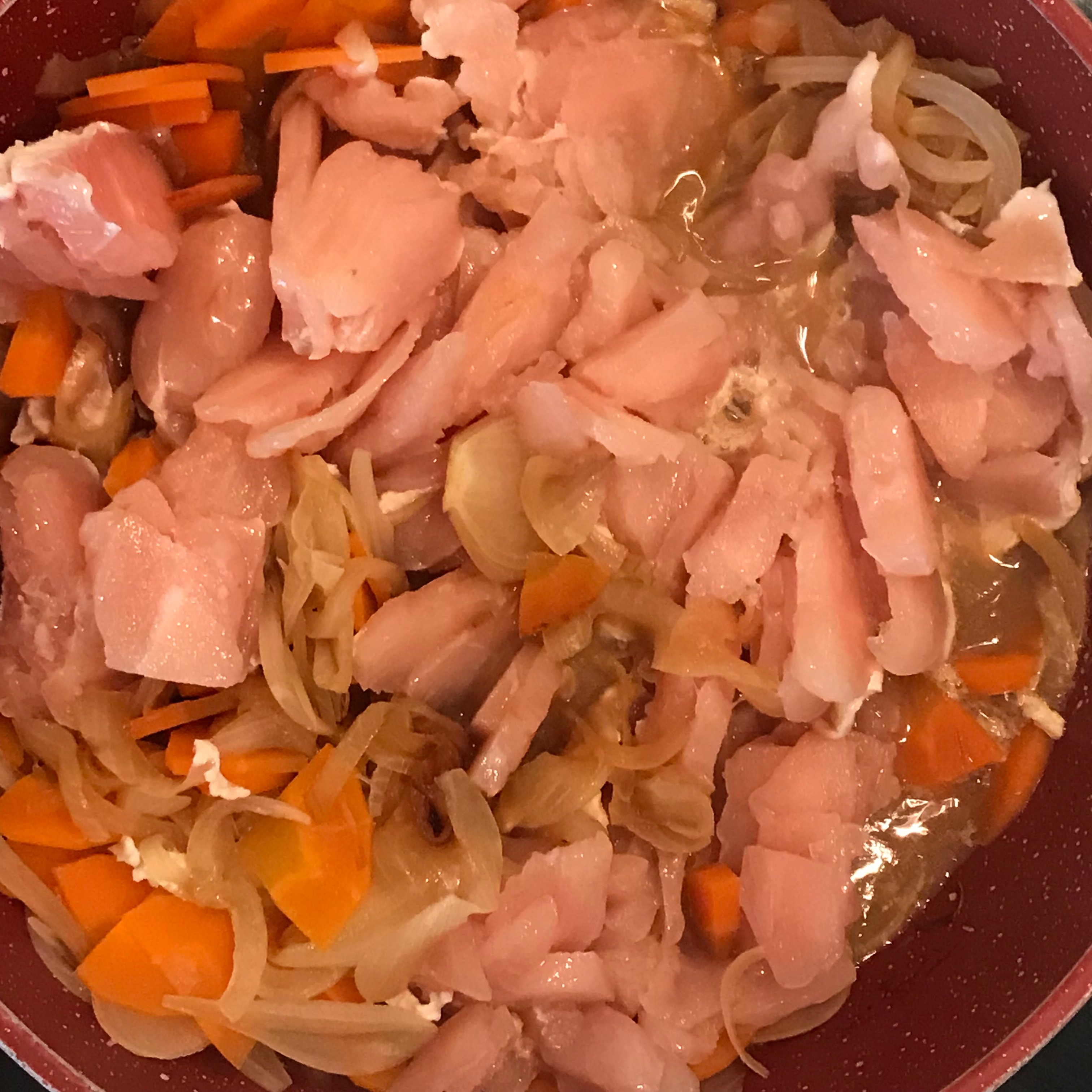 玉ねぎがしんなりしてきたら人参を加えて炒める.必要に応じて水を加える.