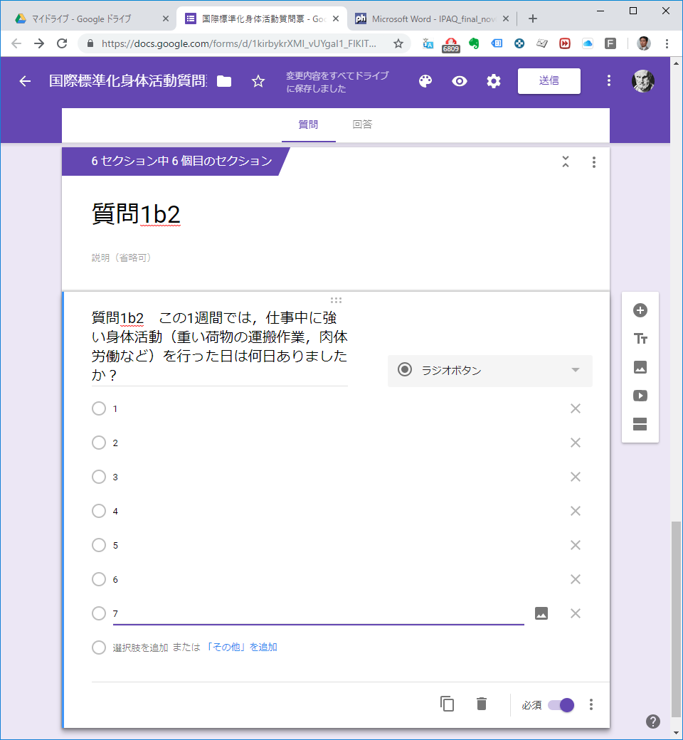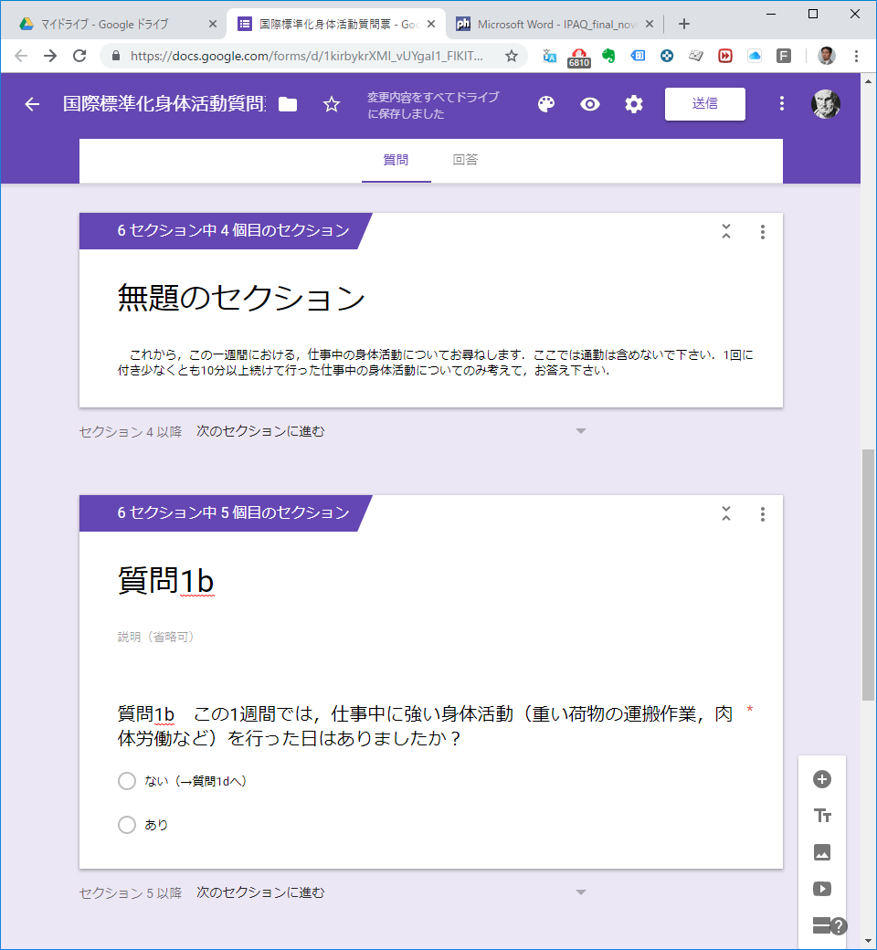 Googleスプレッドシートのフォームでアンケートを作ってみたでは,第 1 正規形でアンケートを取る方法を説明した.今回は選択肢によって質問を条件分岐させる方法について説明する.題材は国際標準化身体活動質問票 (IPAQ) である.