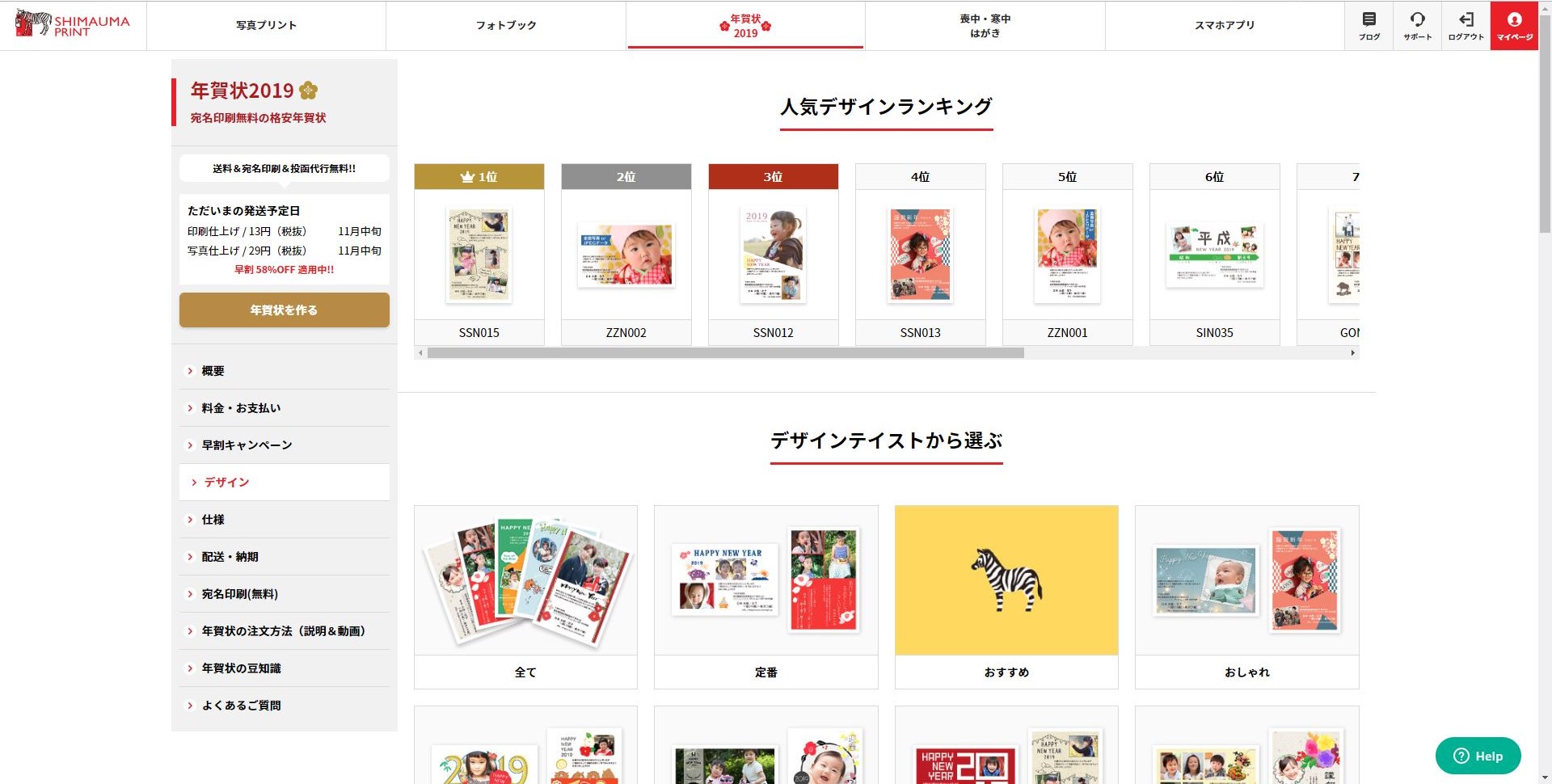 しまうまプリントにログインし,画面上部中央の『年賀状』をクリックする.