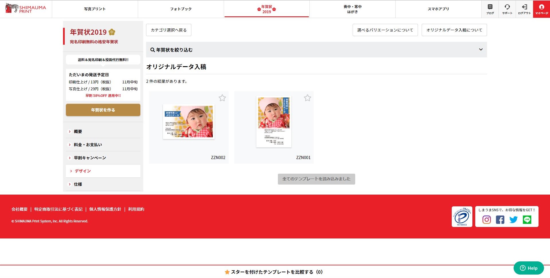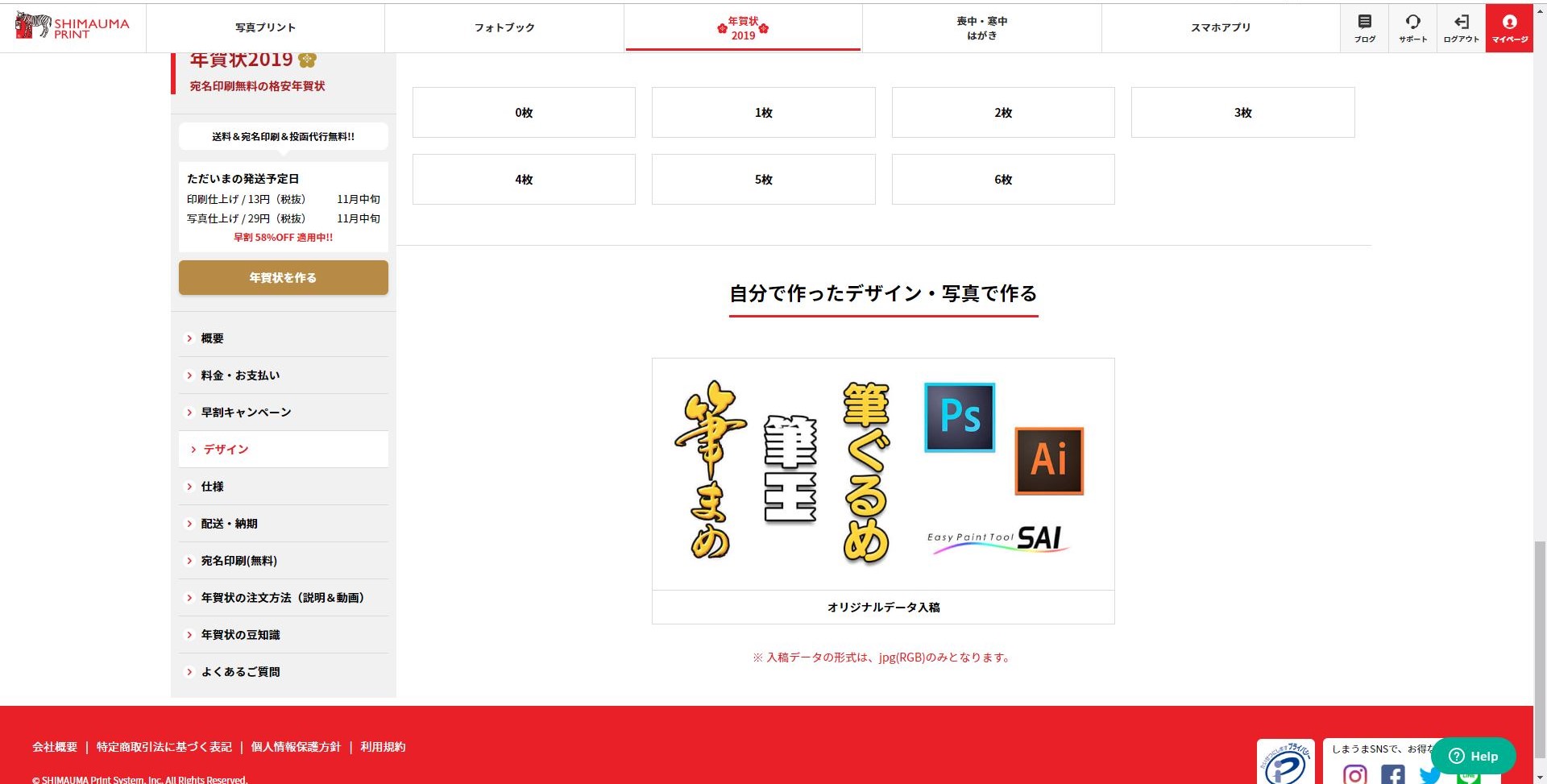 正直,把握しきれていない.各自, Google 検索で調べてみてほしい.料金,納期,デザインの自由度,テンプレートの充実度など,考慮すべき要素はいくつもある.当然ながら 12 月に入ると注文が殺到し始めるため,各社とも 11 月中の料金は安めに設定してある.俺はしまうまプリントでオーダーした.ちなみに 11 月 9 日にオーダーして納品されたのは 11 月 13 日だった.