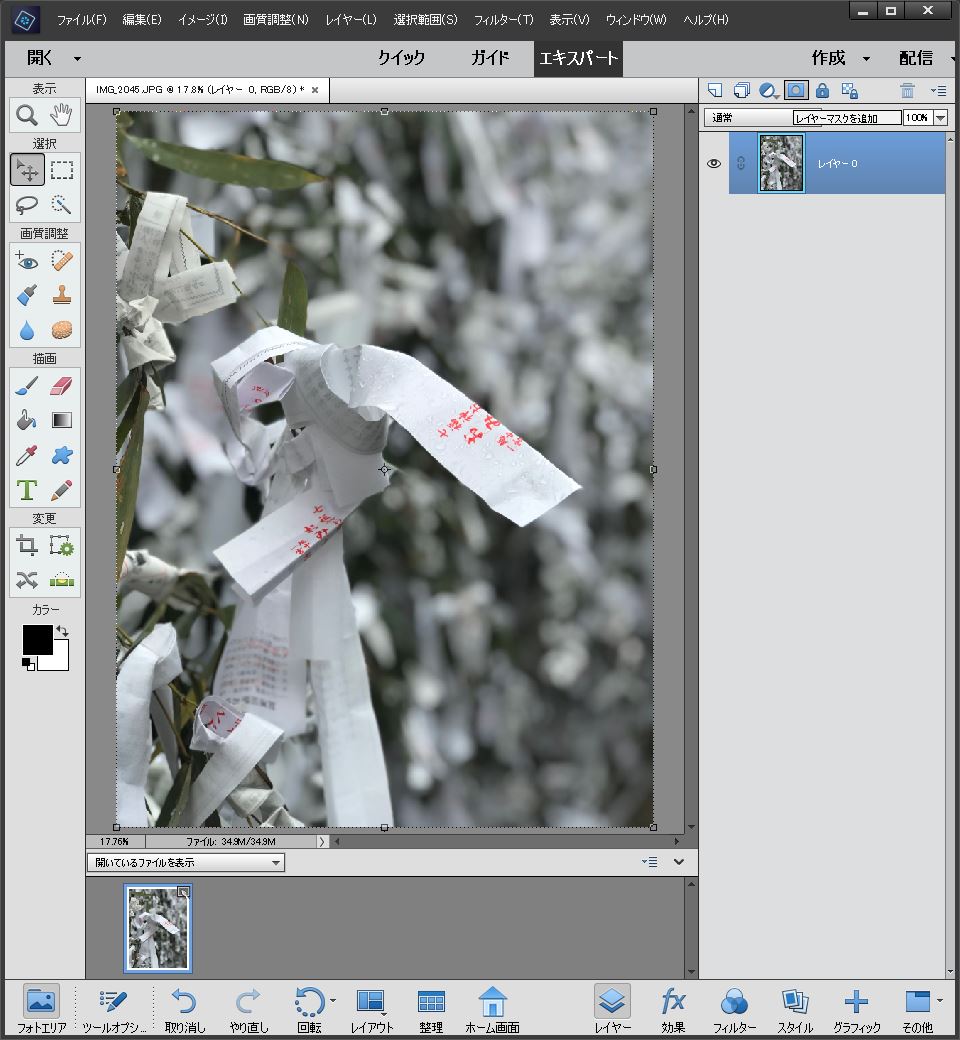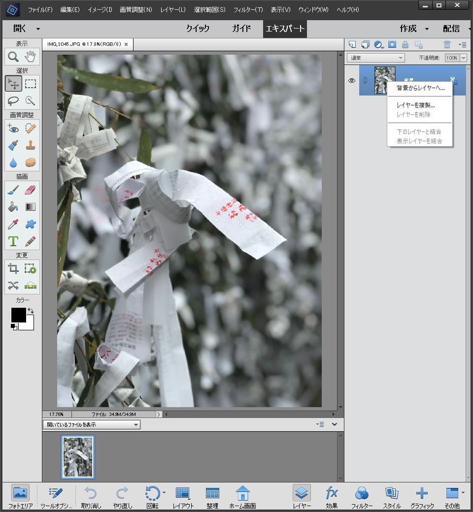 画面右側にレイヤーが表示されている.最初は開いた画像が背景に張り付いている.これを右クリックして『背景をレイヤーに』変換する.この後画像処理をするために必要な措置だ.